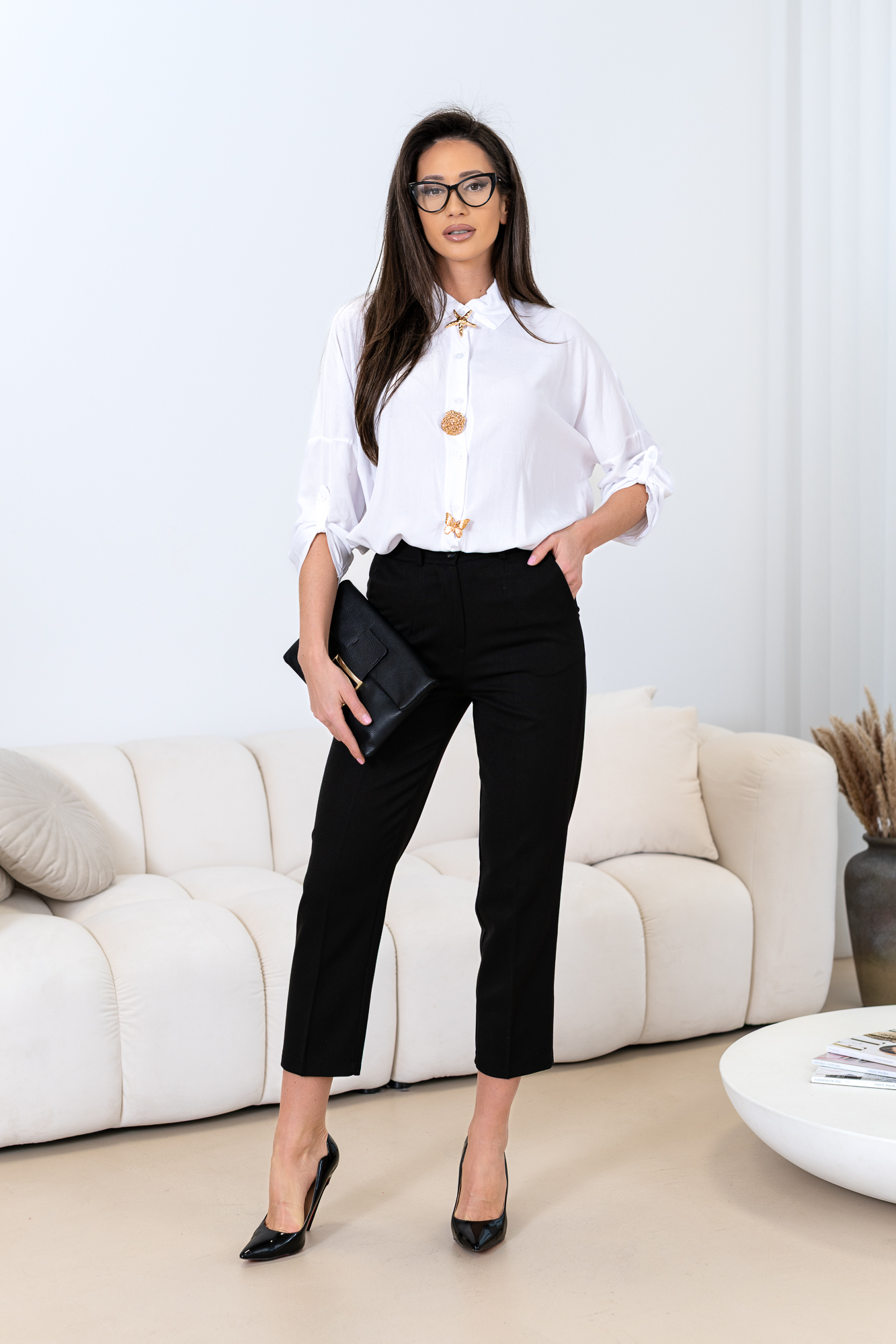 Oversize’owa, przedłużana koszula z bawełnianego materiału. Lekko przedłużony fason, ciekawe ozdobne klamry/broszki przypinane obok guzików, prosty fason wyszczupla i wydłuża sylwetkę. Można nosić z broszkami jak i bez nich (3 broszki). Zapinana na małe guziki. Klasyka, moda i szyk z odrobiną nowoczesności i frywolności. KOSZULA FASON OVERSIZE!!!