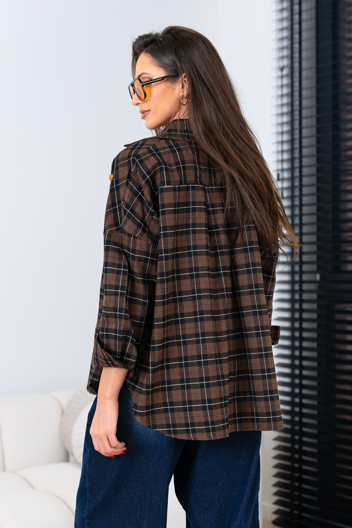 Stylowa koszula w modną brązową kratę z subtelnymi, dekoracyjnymi aplikacjami. Luźny fason zapewnia swobodę i wygodę, a klasyczny kołnierz i guziki dodają całości charakteru. Idealna do noszenia zarówno rozpięta, jak i jako główny element stylizacji – świetnie komponuje się z jeansami, topem lub dopasowanymi spodniami. Koszula będzie fantastycznym, nieoczywistym elementem Twojej garderoby.