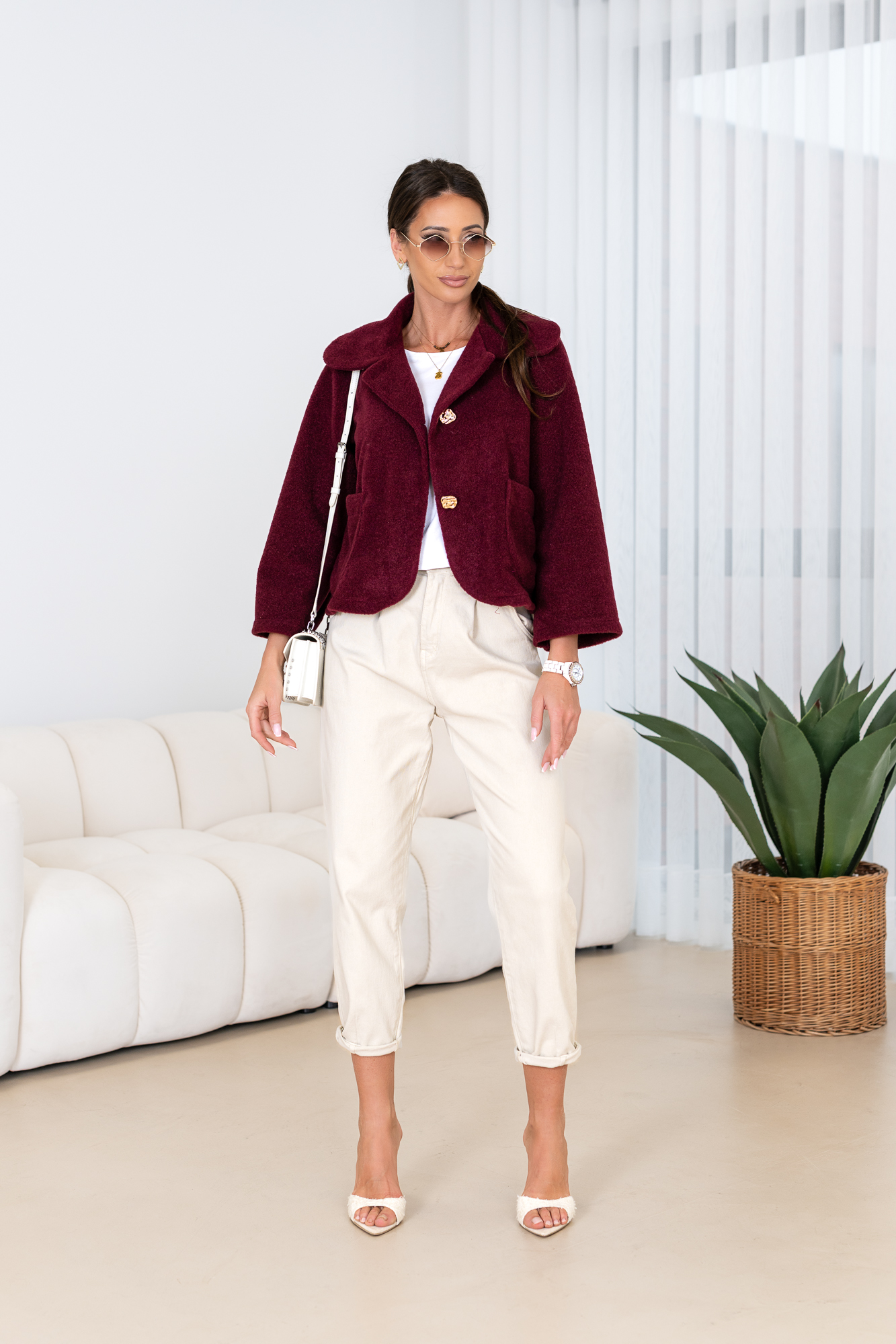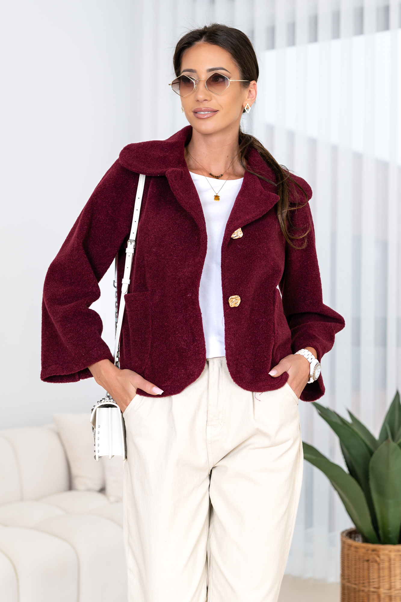 Kurtka o krótszym fasonie wykonana z przyjemnego w dotyku materiału. To model o oversizowym kroju z lekko poszerzanymi rękawami. Posiada kołnierz a także zapięcia na guziki.