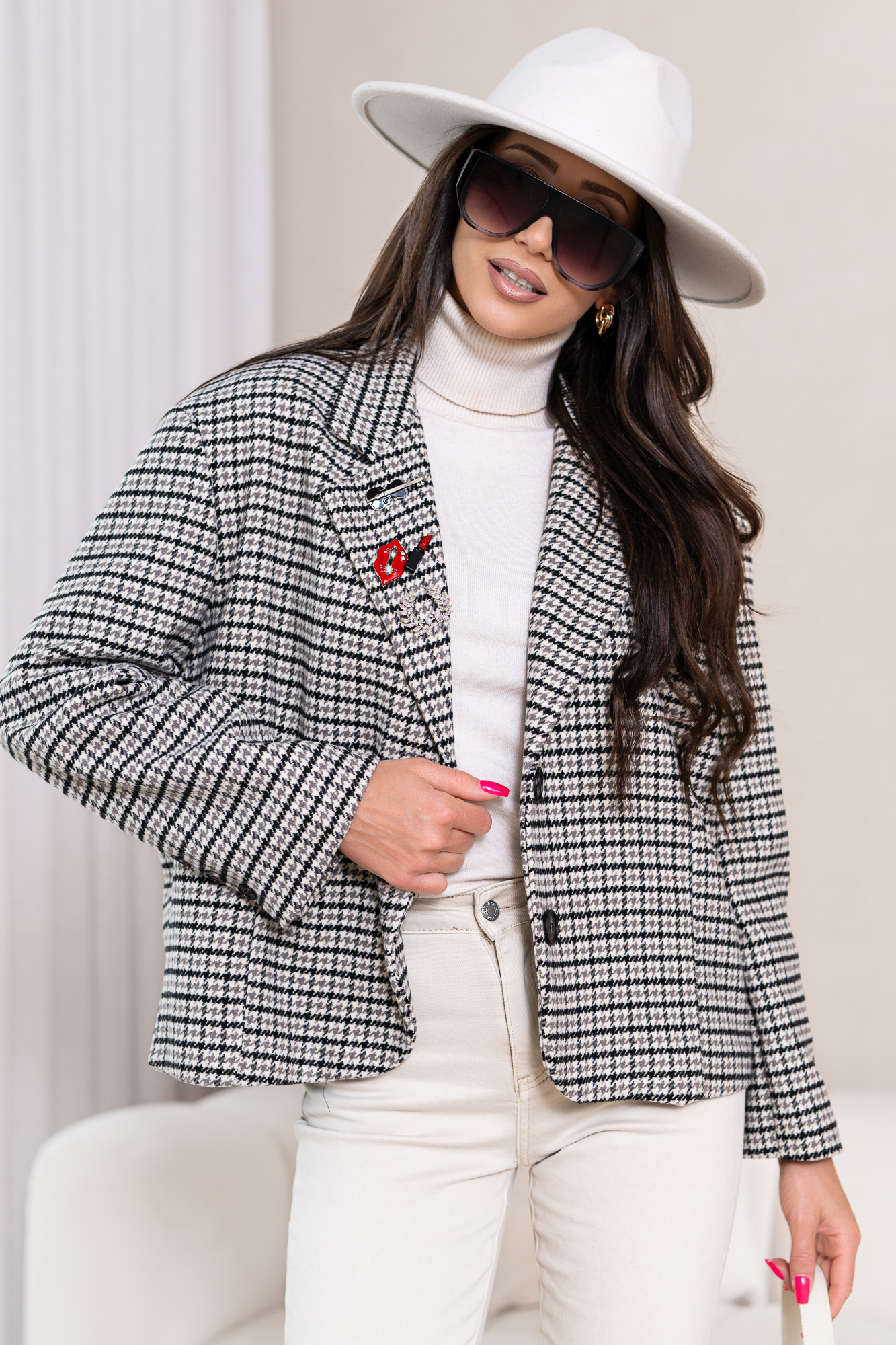 Genialna Marynarka z broszkami w klapie.  Marynarka posiada podszewkę oraz poduszeczki na ramionach a ozdoby na niej to broszki. Ten typ marynarki to totalny Must Have  tego sezonu! Duży obszerny oversize – casualowy fason! Marynarka sprzedawana jest w komplecie z zestawem broszek.
