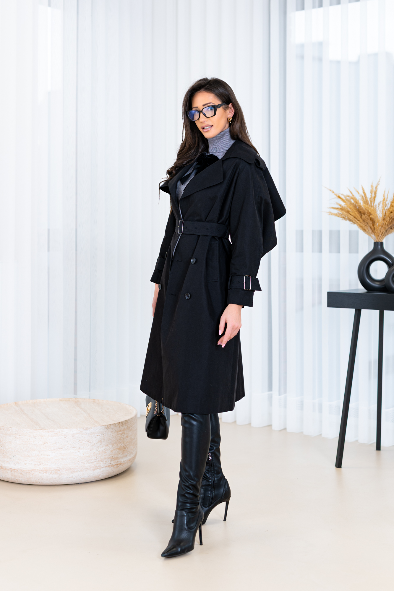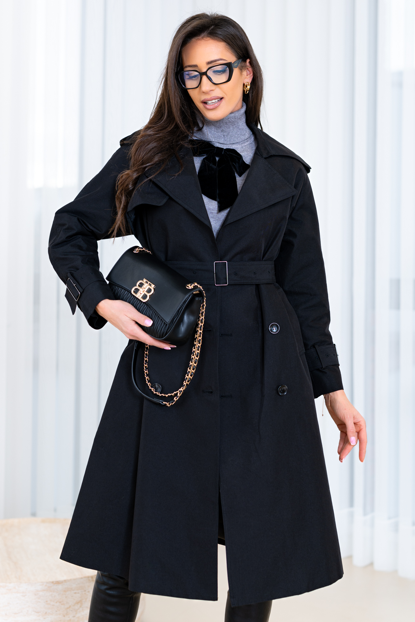 Przedstawiamy elegancję w czystej postaci – nasz luksusowy czarny płaszcz to prawdziwa esencja klasy i nowoczesnego stylu. Wykonany z najwyższej jakości materiału, który stanowi idealne połączenie wytrzymałości i komfortu, gwarantuje nieskazitelny wygląd przez cały dzień. Głęboki czarny kolor płaszczu sprawia, że jest uniwersalny i pasuje do każdej stylizacji, dodając jej niebywałej elegancji i szyku. Świetnie podkreśla sylwetkę i daje poczucie pewności siebie dzięki dopasowanemu krojowi oraz stylowemu paskowi w talii. Niezależnie od okazji, dzięki temu trenczowi zawsze będziesz wyglądać zjawiskowo. Idealny zarówno na codzienne wyjścia, jak i na wyjątkowe okazje.