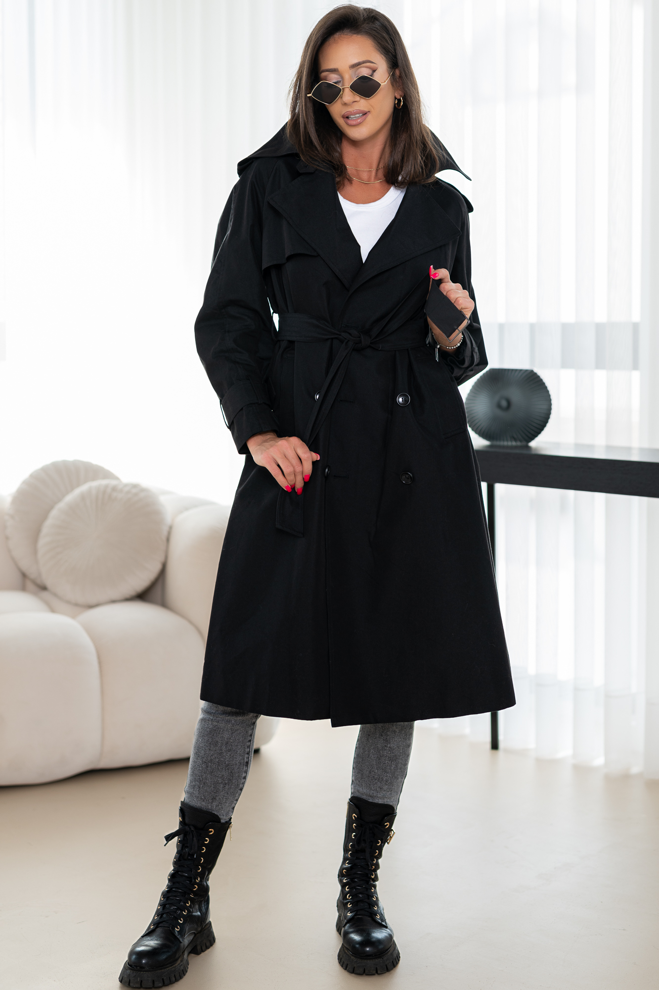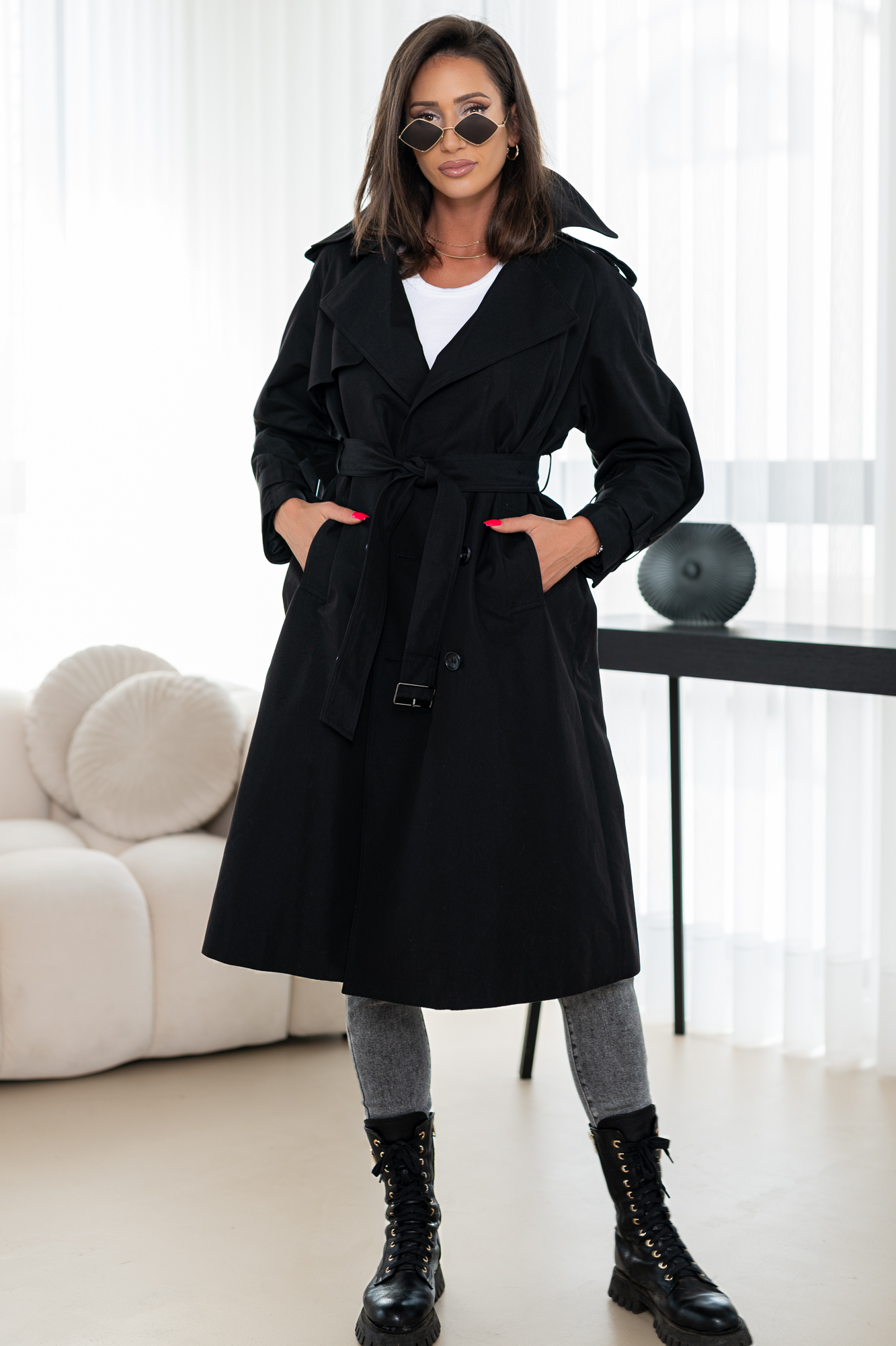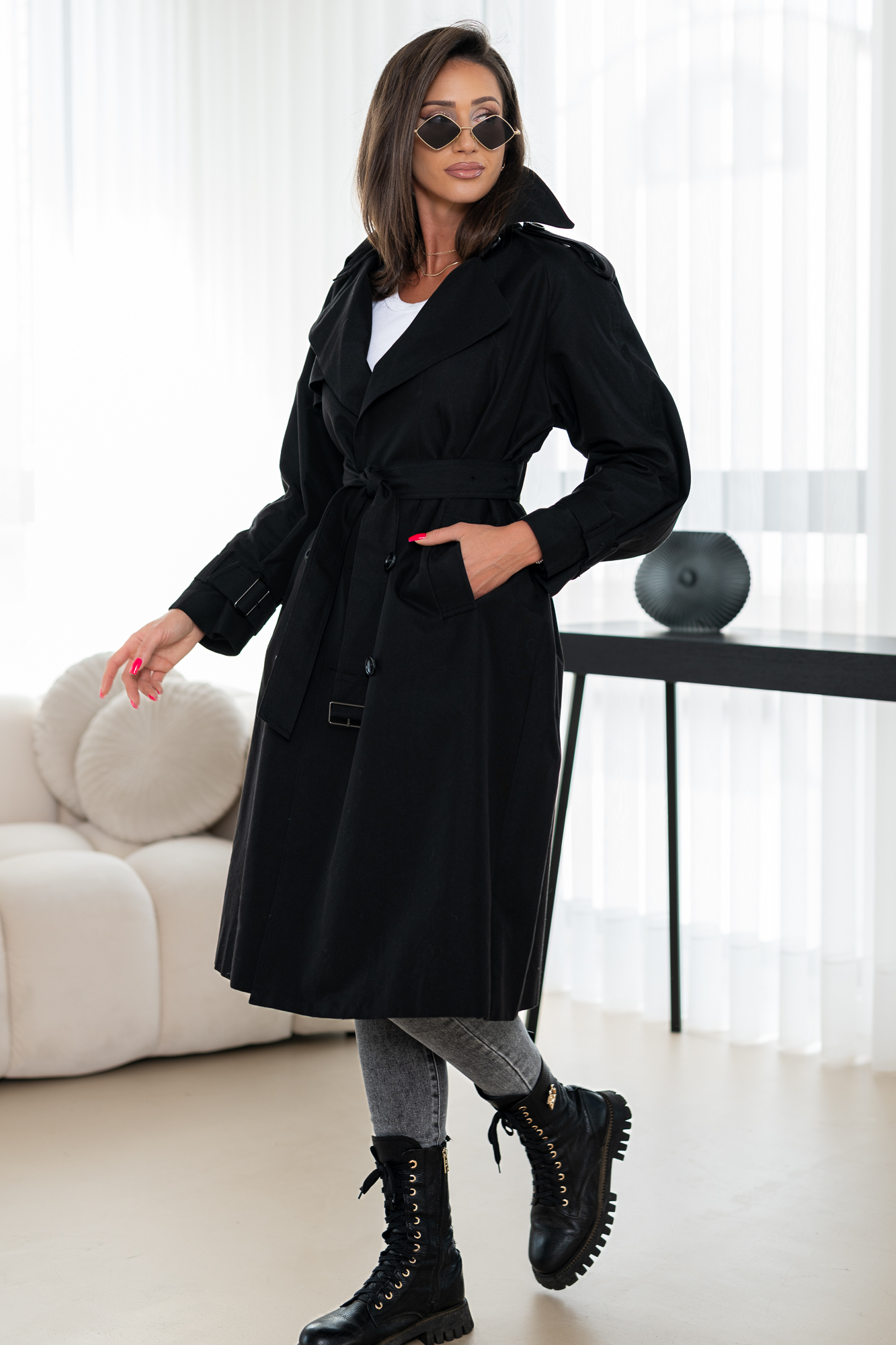 Przedstawiamy elegancję w czystej postaci – nasz luksusowy czarny płaszcz to prawdziwa esencja klasy i nowoczesnego stylu. Wykonany z najwyższej jakości materiału, który stanowi idealne połączenie wytrzymałości i komfortu, gwarantuje nieskazitelny wygląd przez cały dzień. Głęboki czarny kolor płaszczu sprawia, że jest uniwersalny i pasuje do każdej stylizacji, dodając jej niebywałej elegancji i szyku. Świetnie podkreśla sylwetkę i daje poczucie pewności siebie dzięki dopasowanemu krojowi oraz stylowemu paskowi w talii. Niezależnie od okazji, dzięki temu trenczowi zawsze będziesz wyglądać zjawiskowo. Idealny zarówno na codzienne wyjścia, jak i na wyjątkowe okazje.