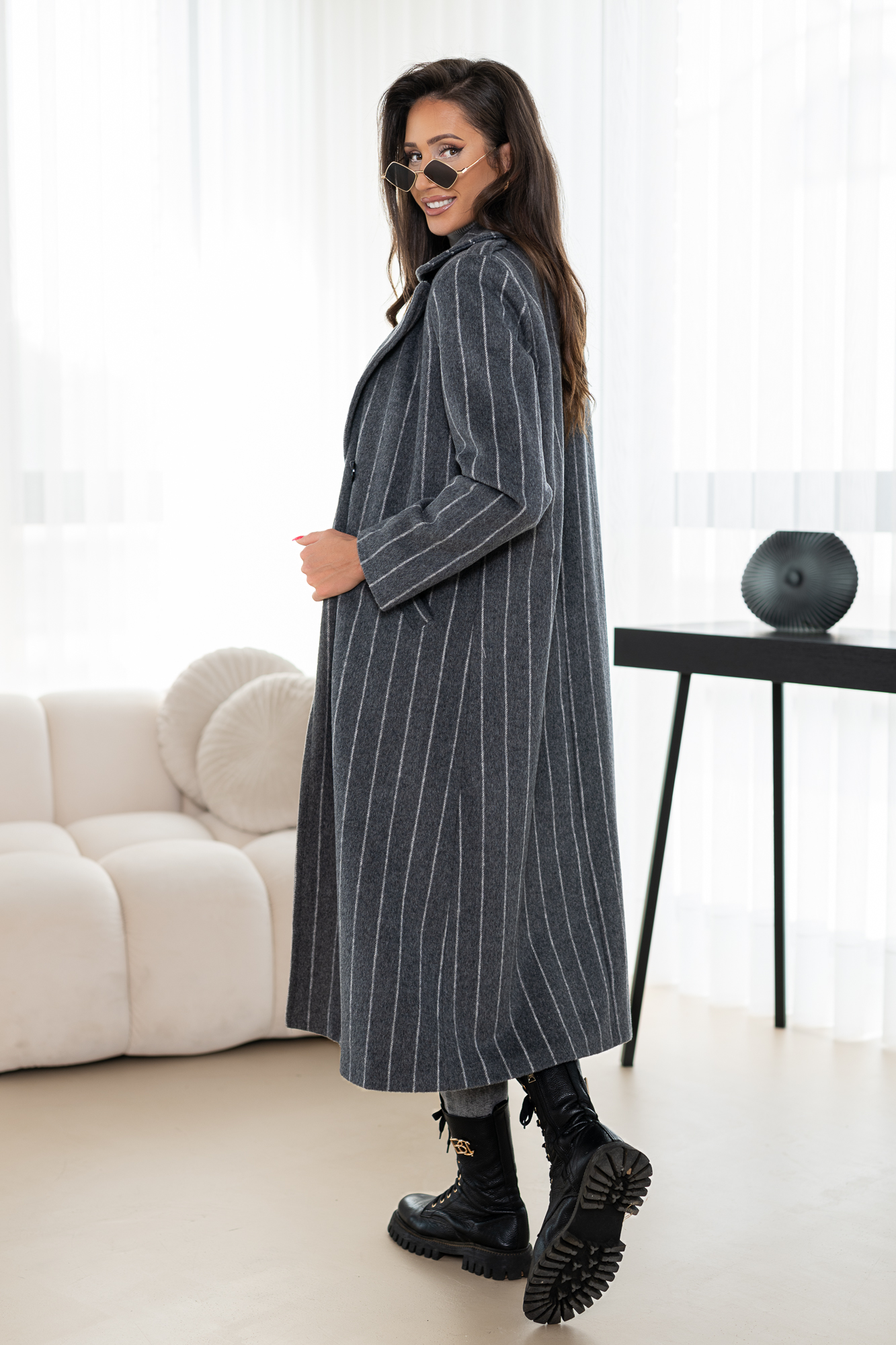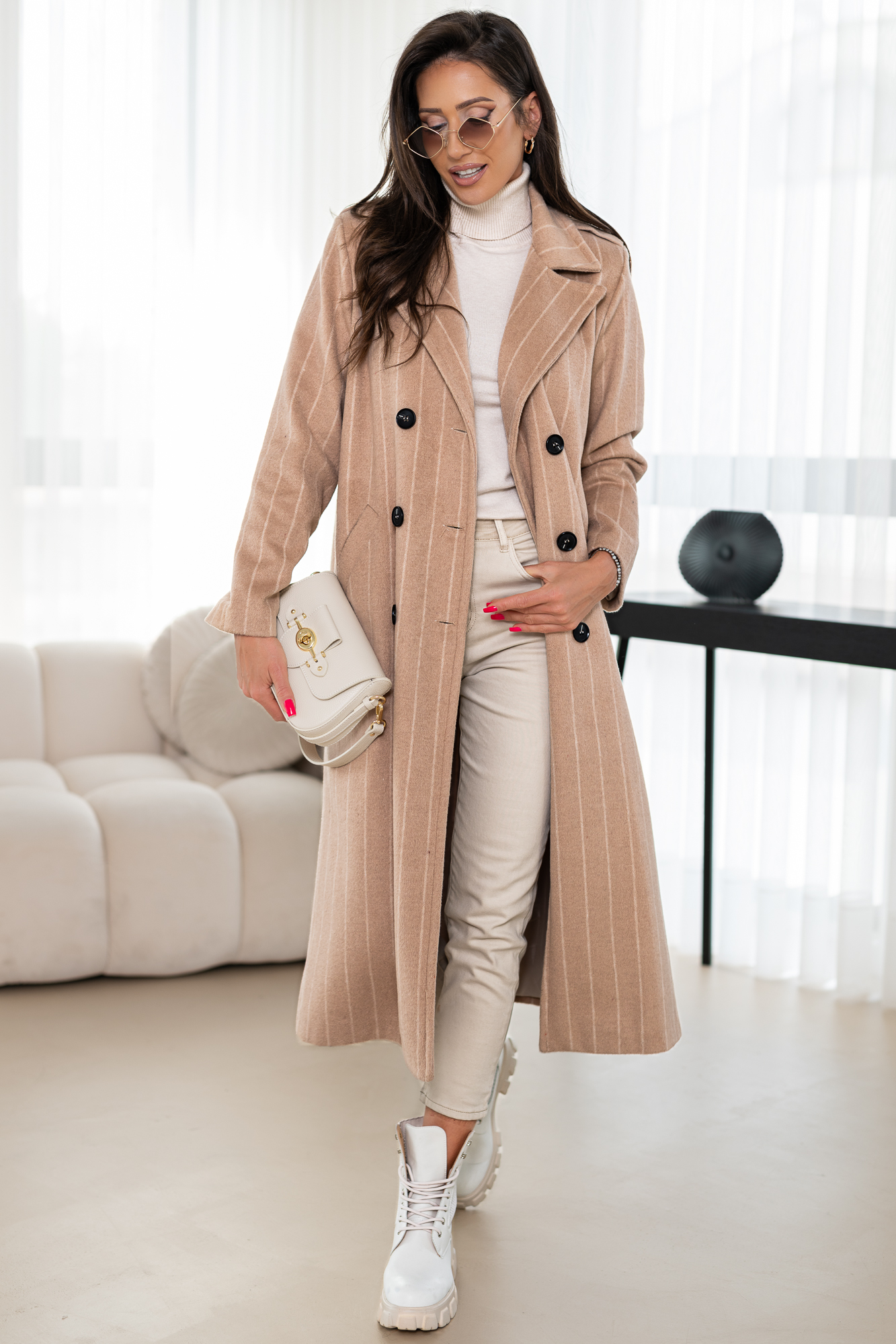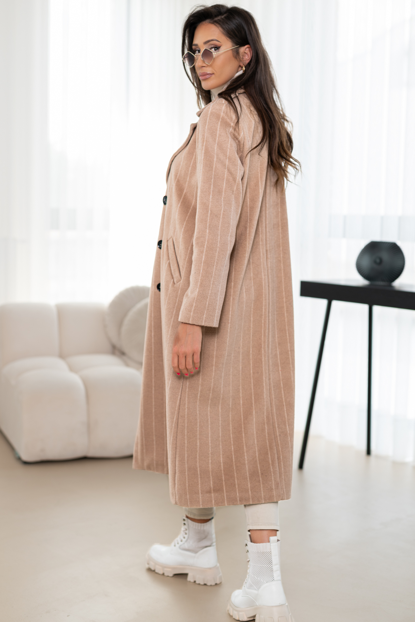Długi płaszcz z domieszką wełny zapinany na guziki. Model – cudownie otulający ciało w zimne nawet mroźne dni! Płacz w całości na podszewce.