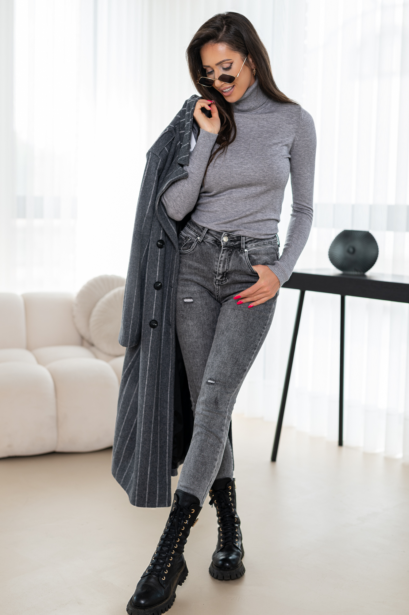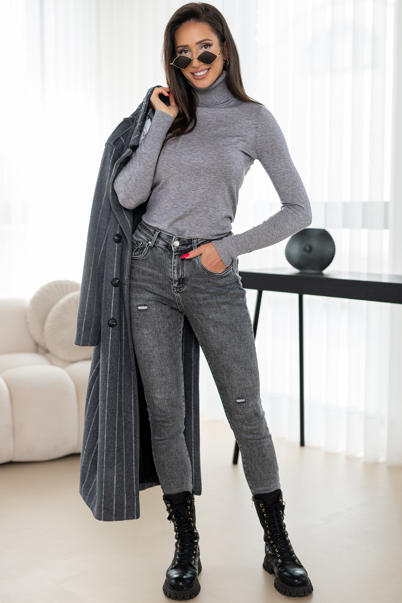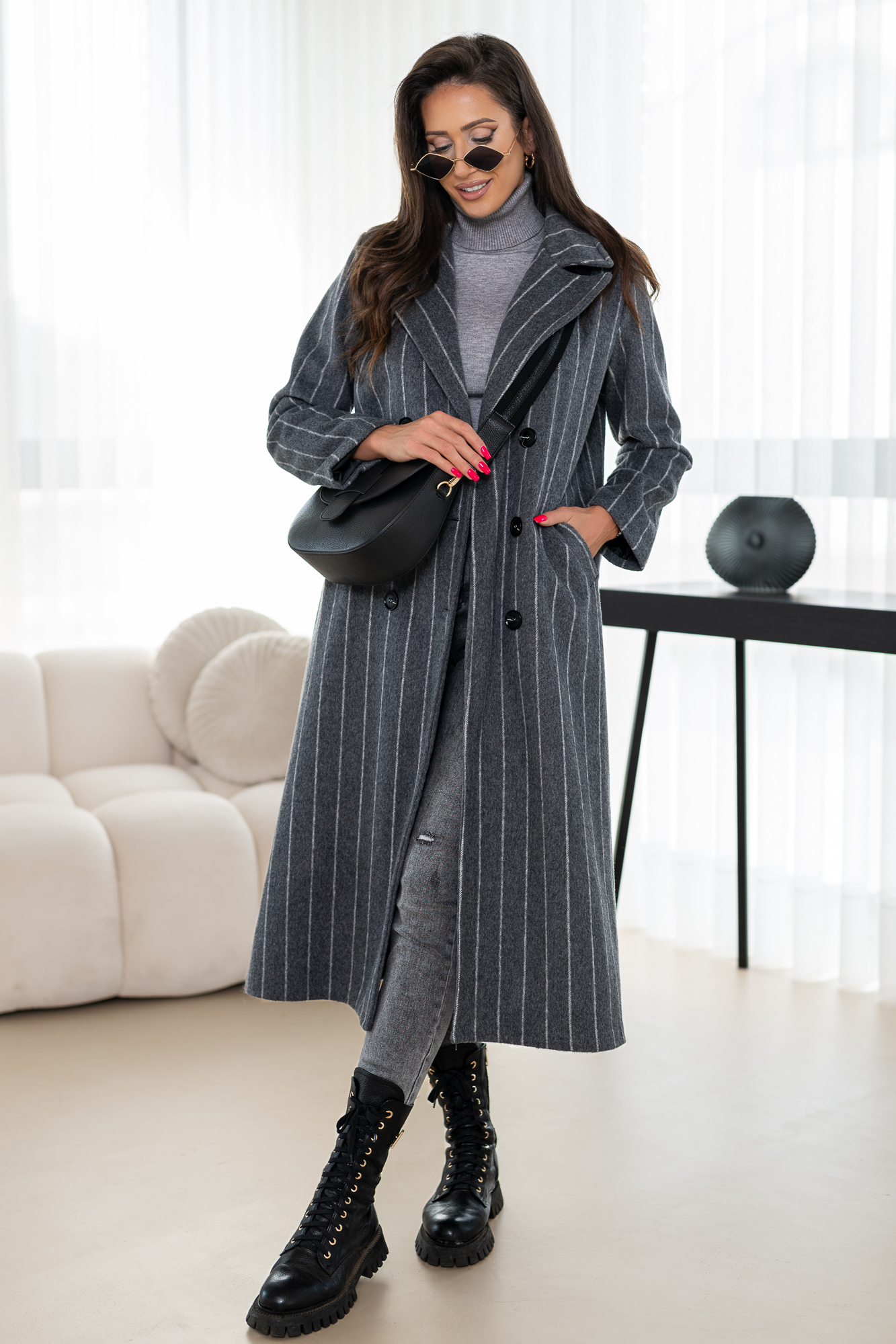 Długi płaszcz z domieszką wełny zapinany na guziki. Model – cudownie otulający ciało w zimne nawet mroźne dni! Płacz w całości na podszewce.