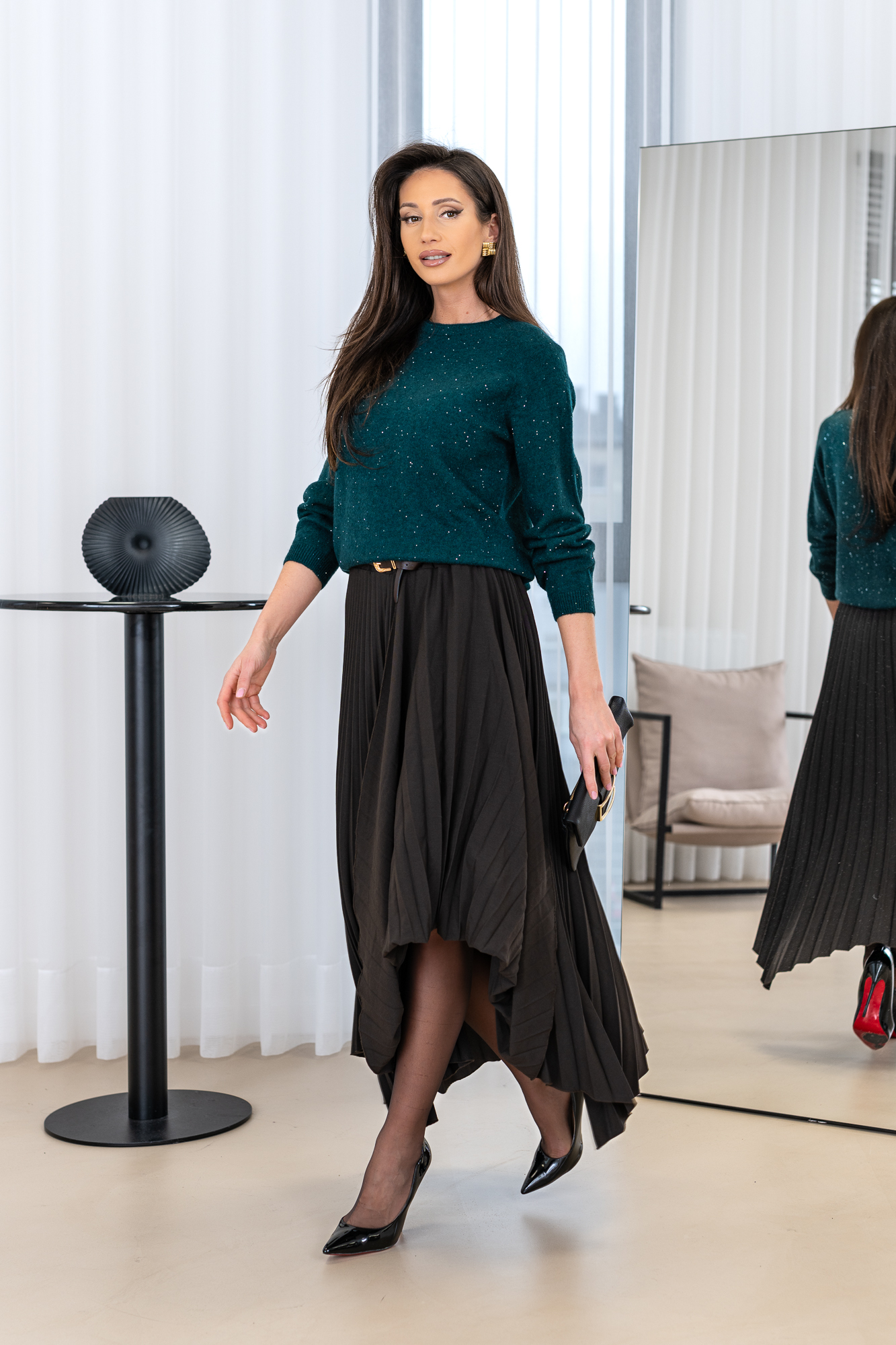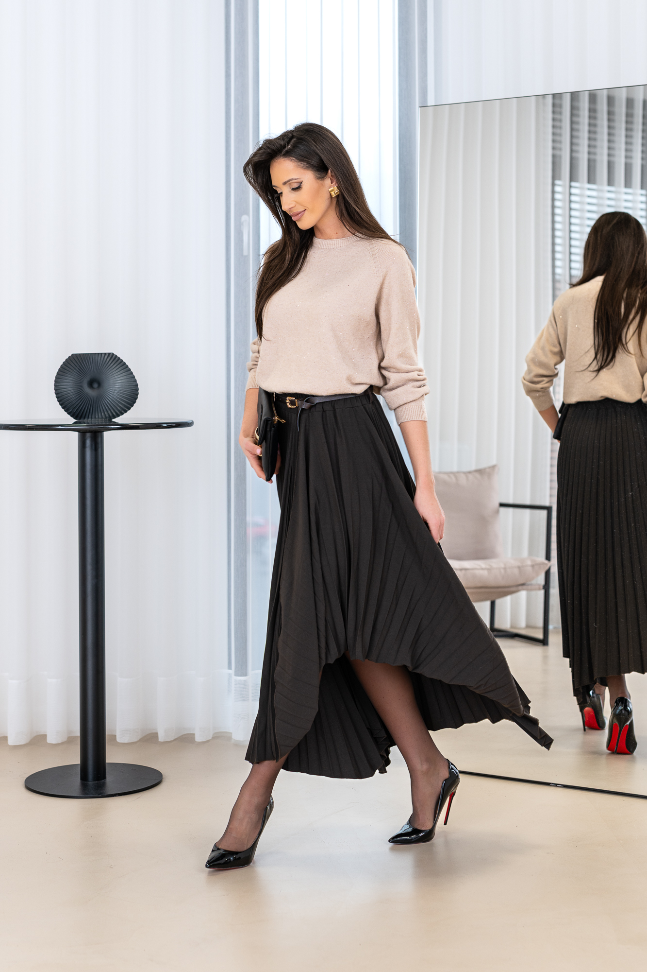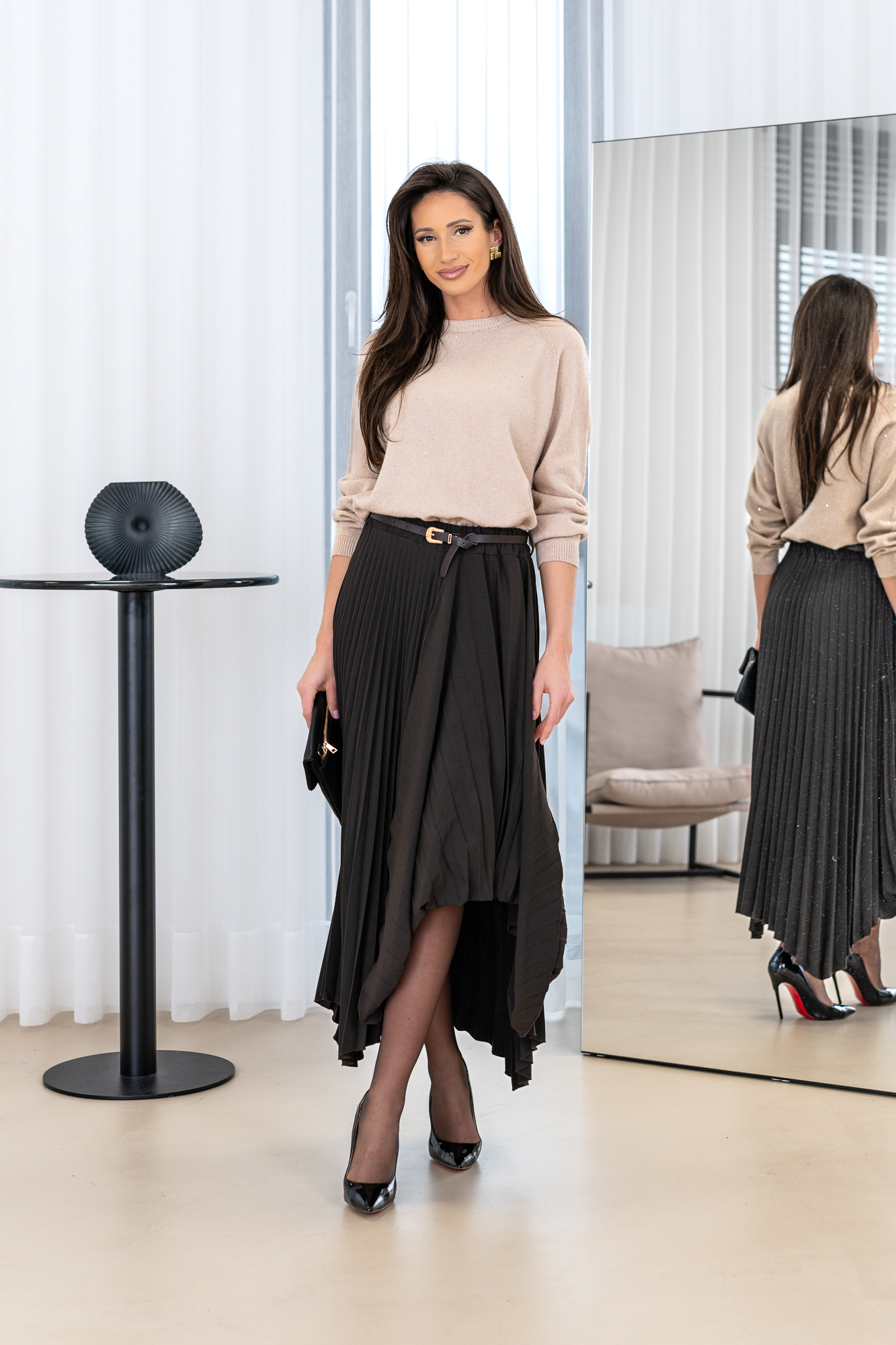 Spódnica Darmond  nieregularny kształt i plisy nadają spódnicy wyjątkowego uroku . Spódnica ma krój trapezu. Posiada gumkę co powoduje że idealnie dopasowuje się do każdej figury. Spódnica sprzedawana w komplecie z paskiem.