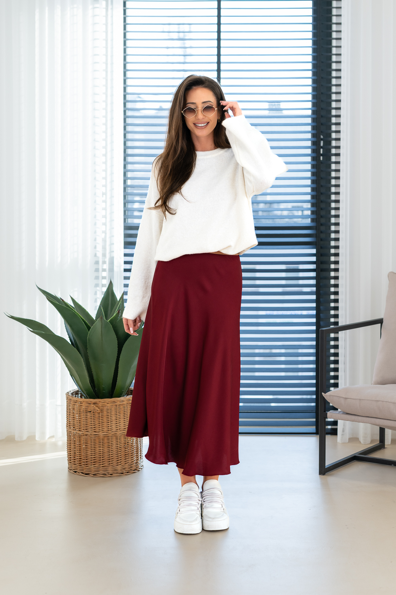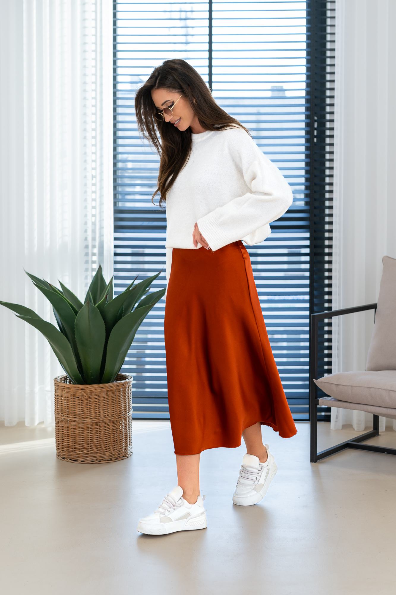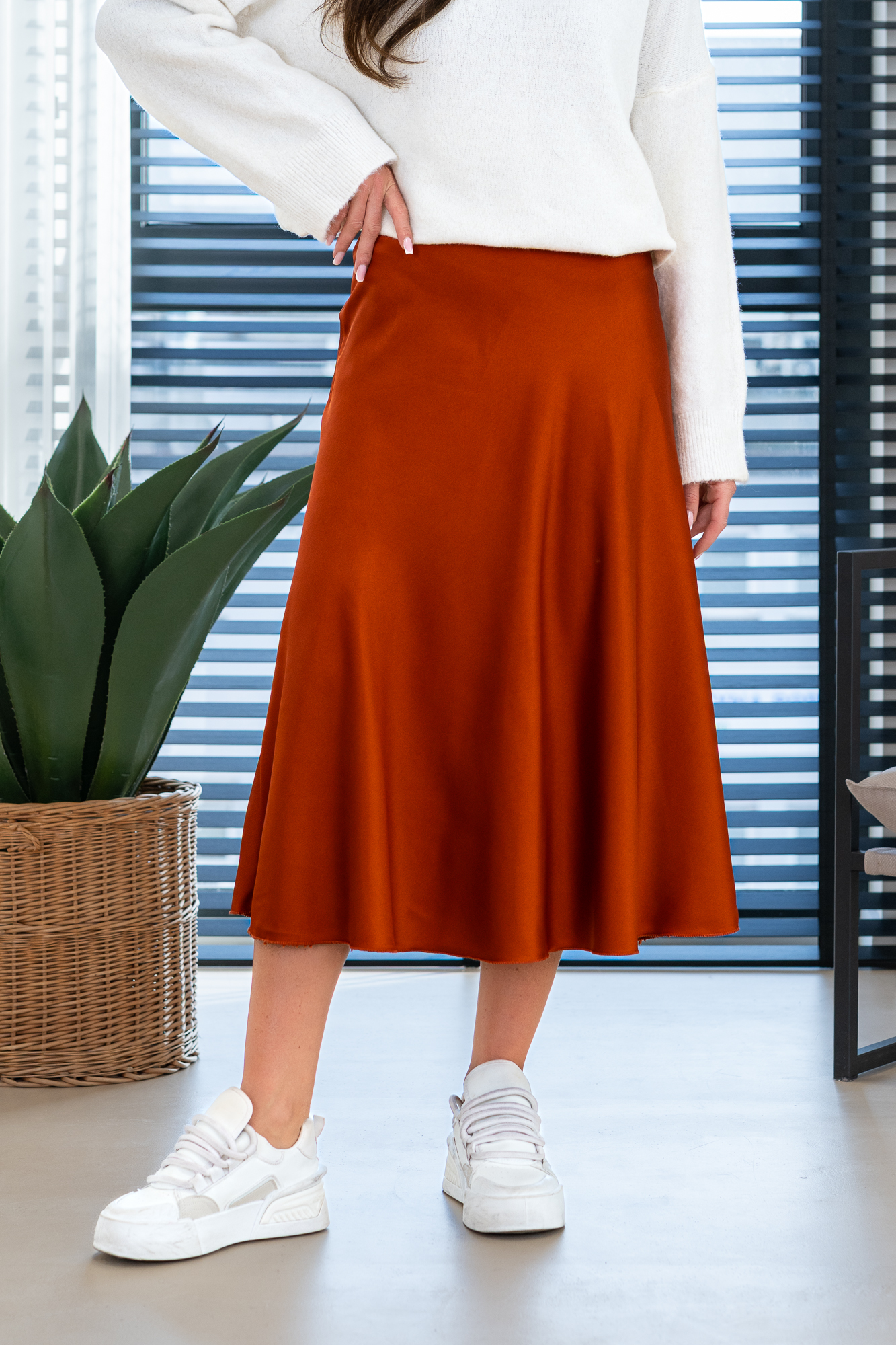 Spódnica Glorii poszerzana do dołu. Posiada gumkę w pasie. Będzie idealnie wygląda zarówno z gładkim topem jak i z grubym swetrem na chłodniejsze dni.