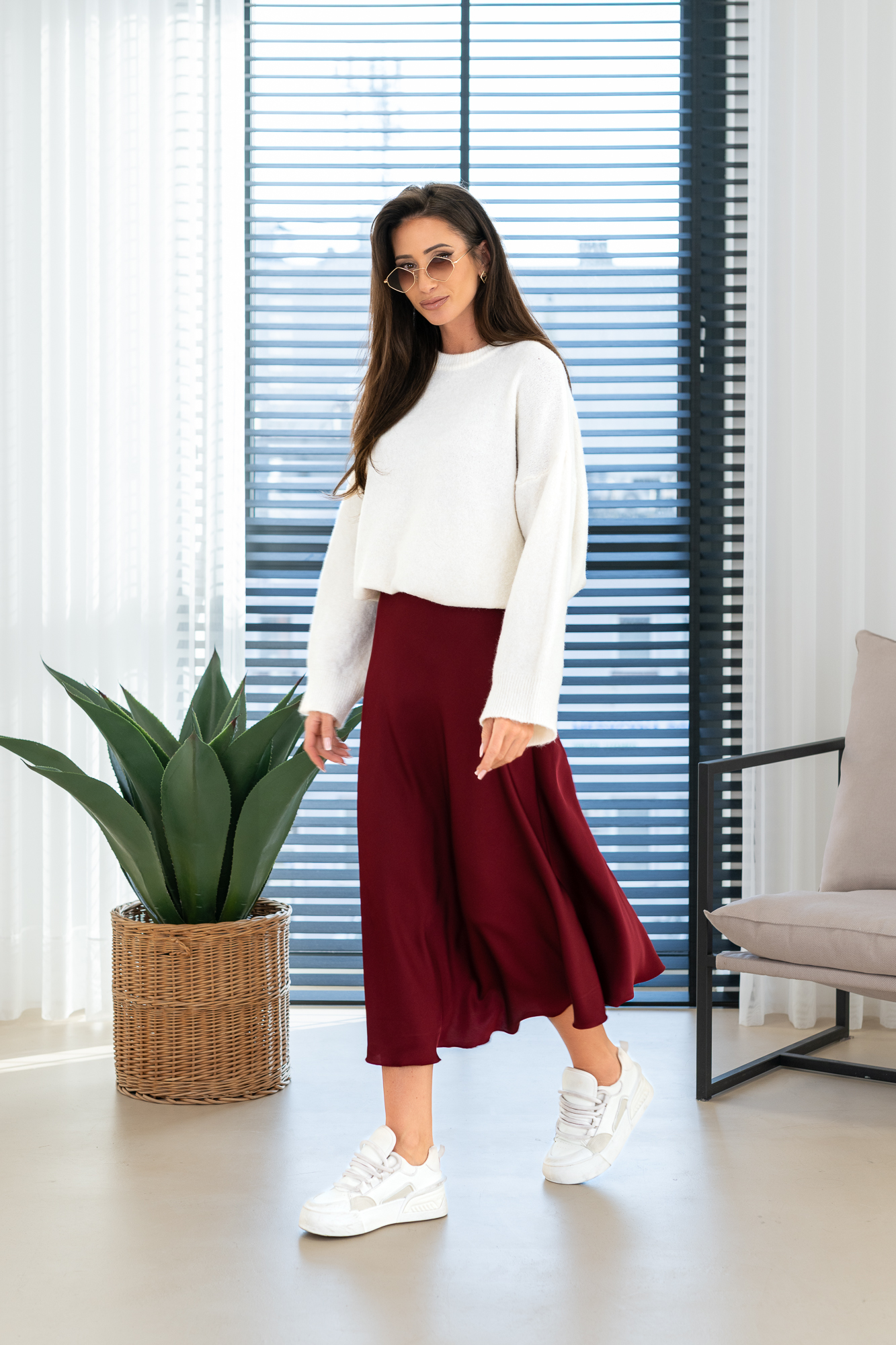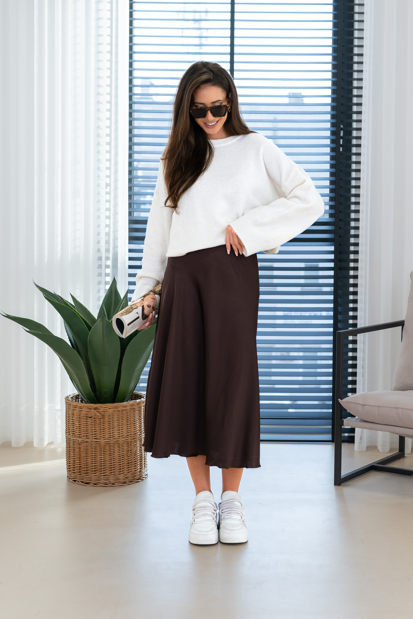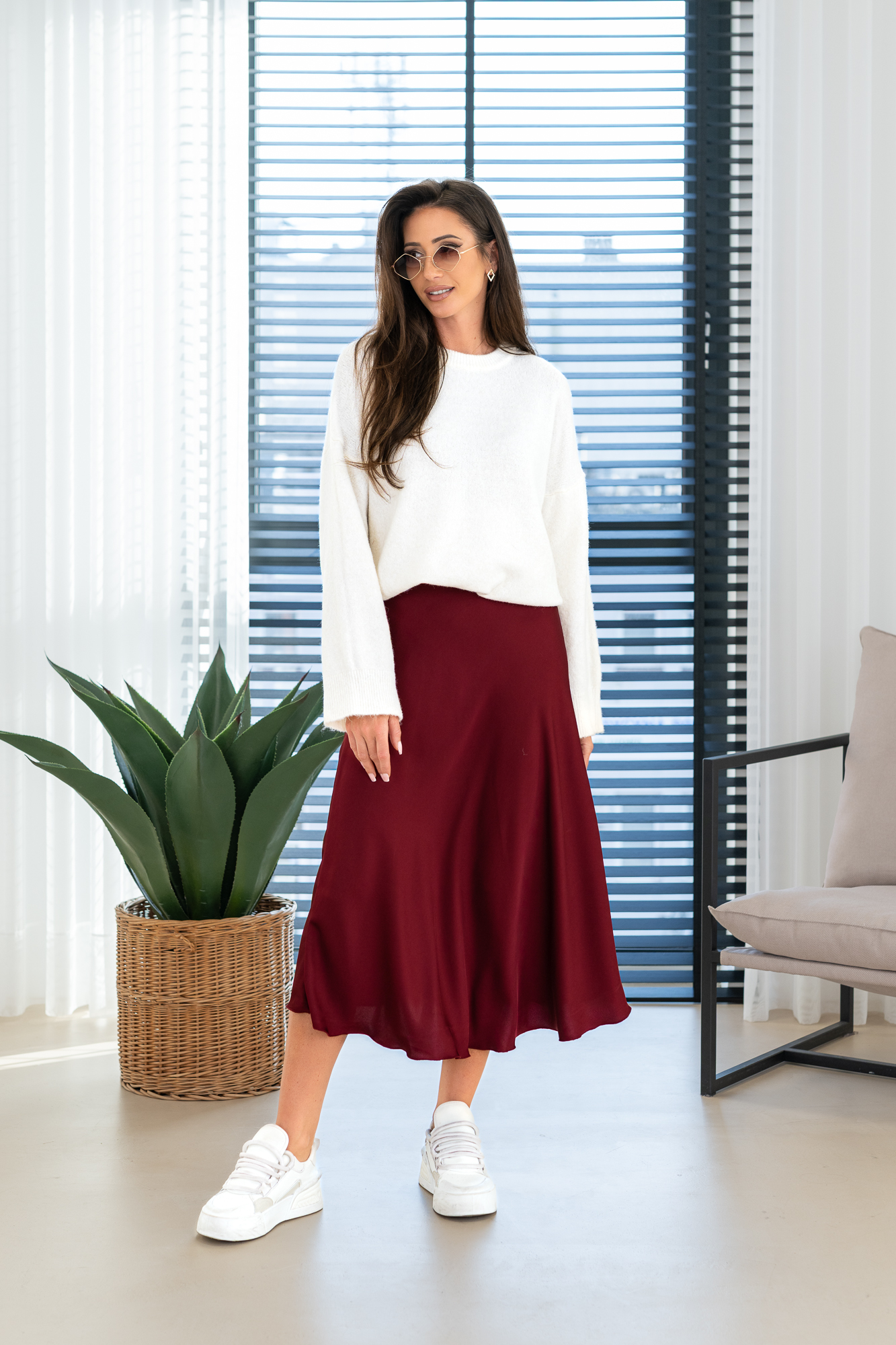Spódnica Glorii poszerzana do dołu. Posiada gumkę w pasie. Będzie idealnie wygląda zarówno z gładkim topem jak i z grubym swetrem na chłodniejsze dni.