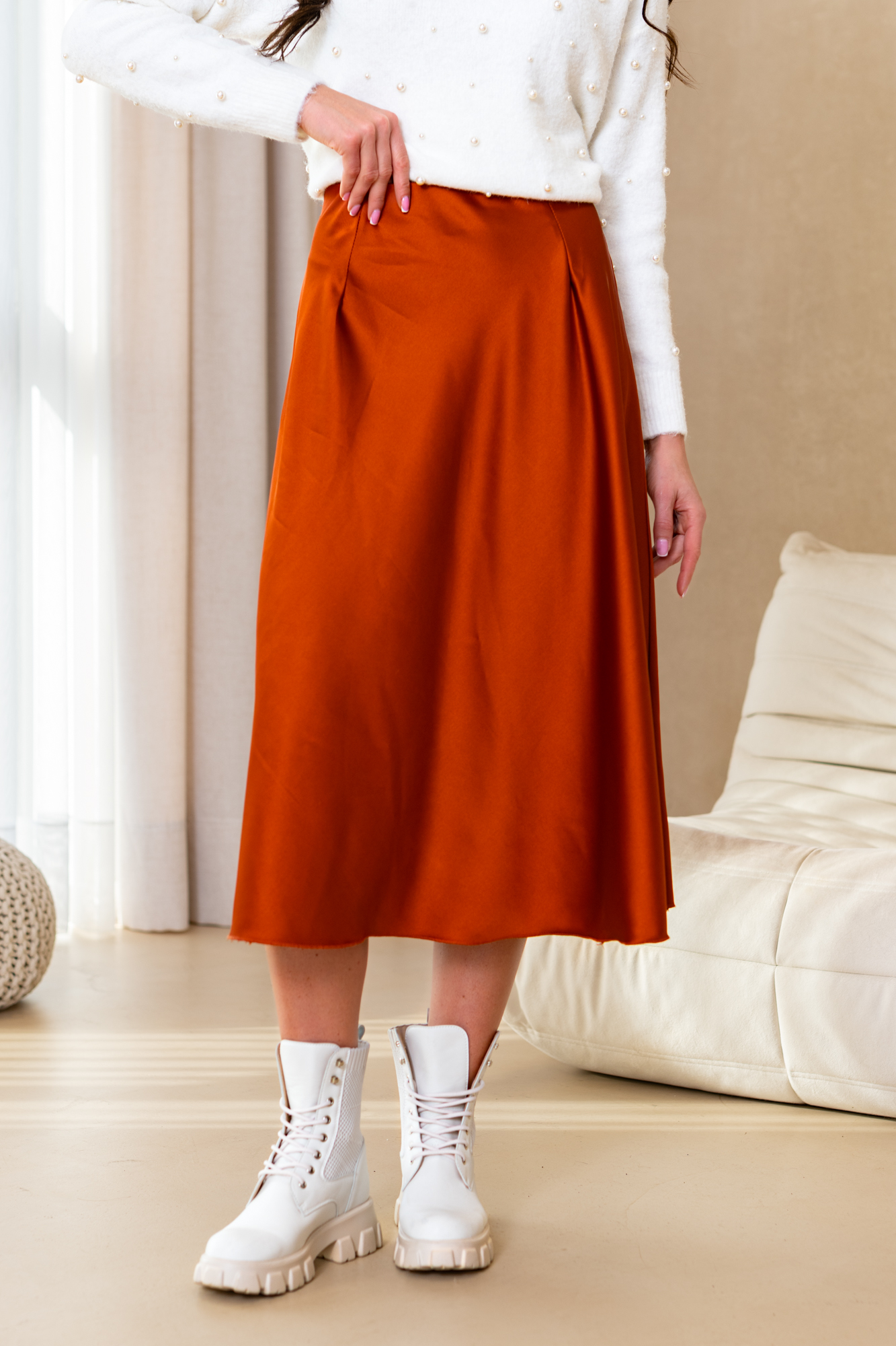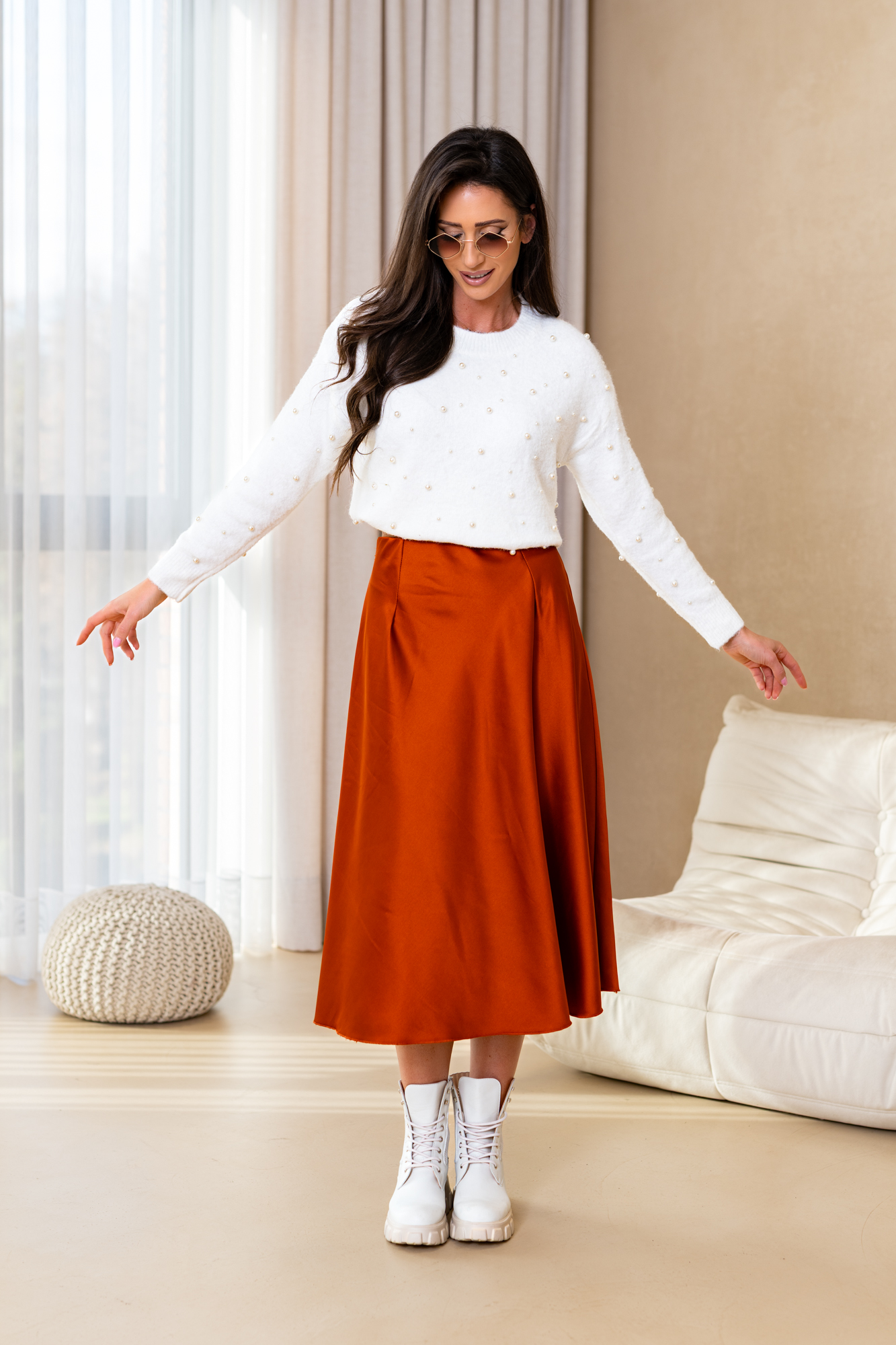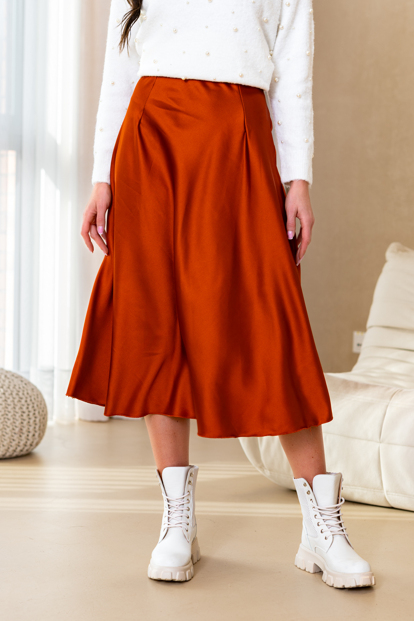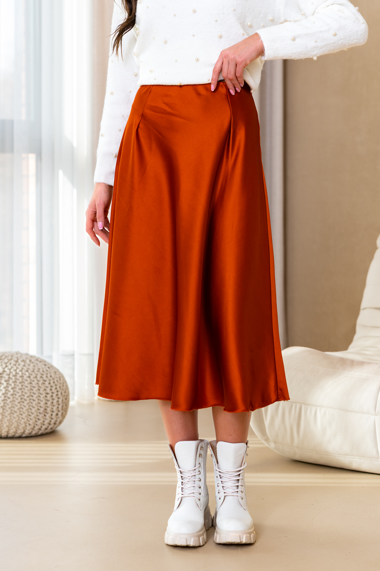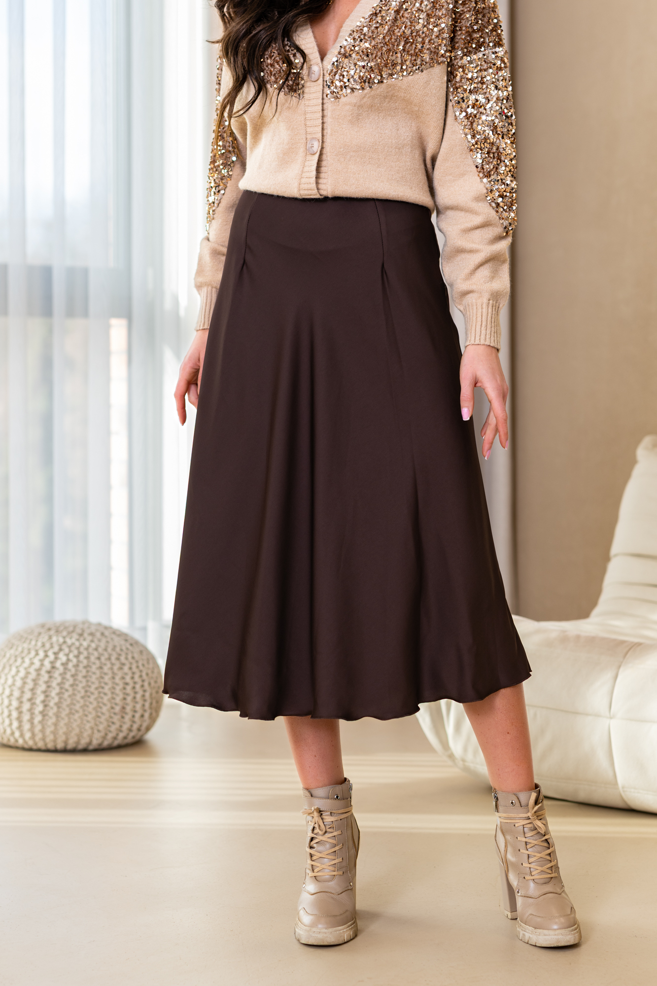 Spódnica Glorii poszerzana do dołu. Posiada gumkę w pasie. Będzie idealnie wygląda zarówno z gładkim topem jak i z grubym swetrem na chłodne dni.