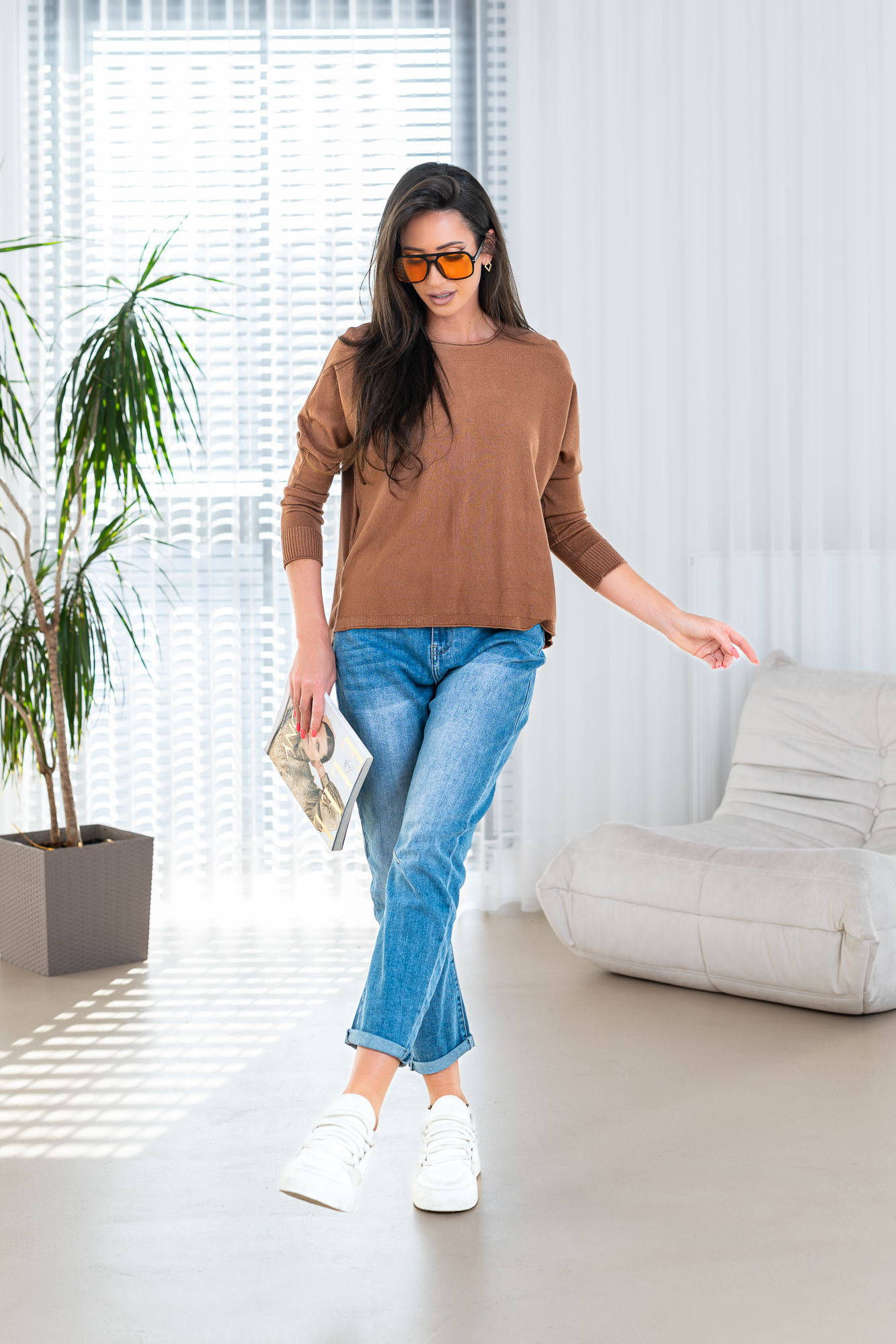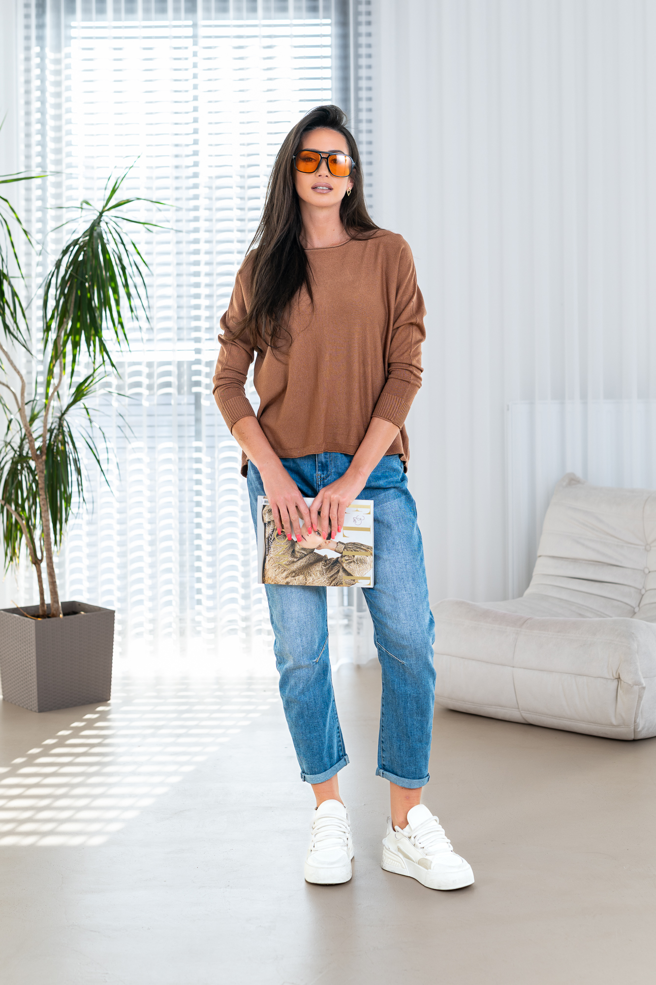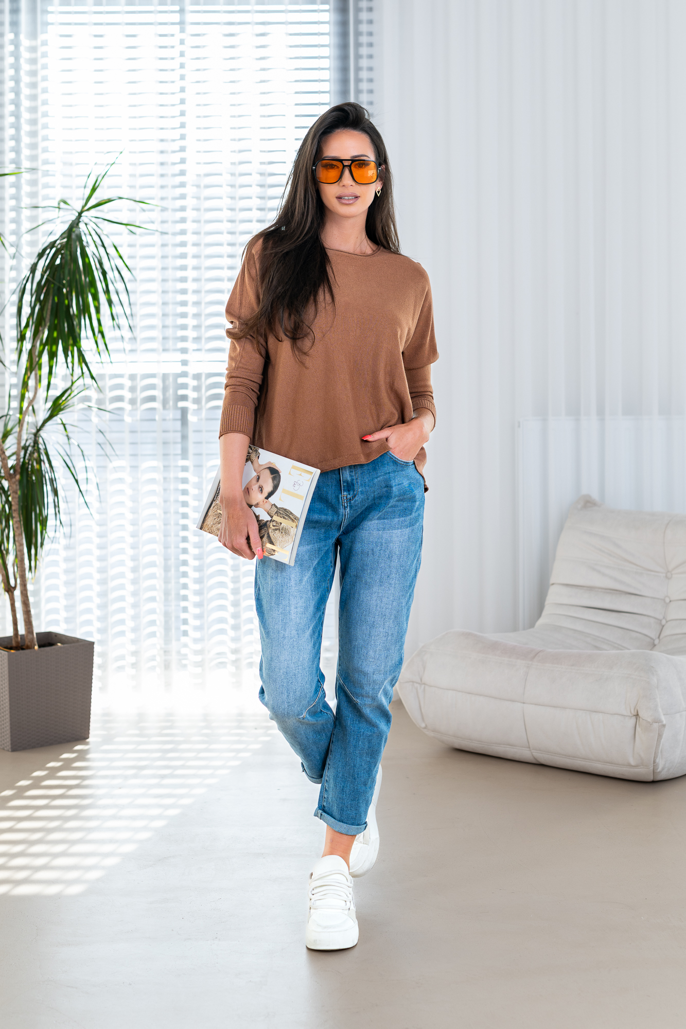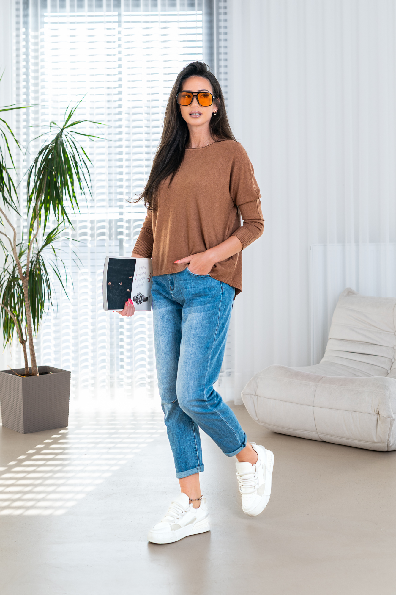 Sweter „Back Detail” to połączenie prostoty i subtelnej oryginalności. Klasyczny, luźny fason zapewnia komfort noszenia i swobodę ruchów, a miękka, przyjemna w dotyku dzianina doskonale sprawdza się w codziennych stylizacjach. Wyjątkowym akcentem są dekoracyjne guziki umieszczone na plecach, które nadają całości nowoczesnego charakteru i przyciągają spojrzenia. Model świetnie komponuje się zarówno z jeansami, jak i bardziej eleganckimi spodniami czy spódnicą, tworząc stylowy, a jednocześnie niezobowiązujący look. Idealny wybór na sezon przejściowy i chłodniejsze dni.