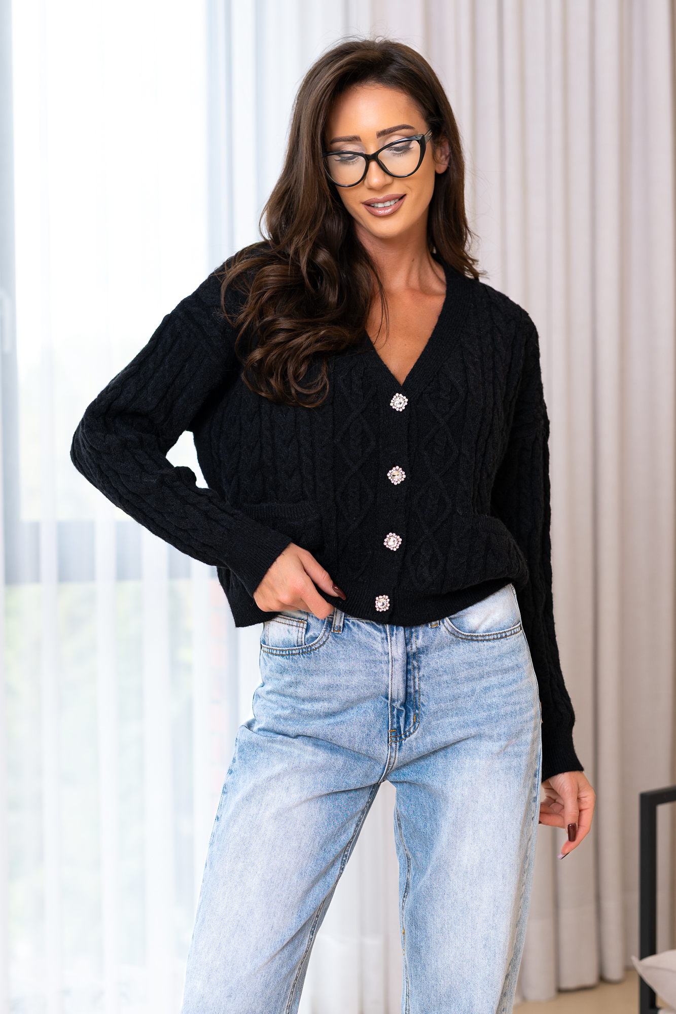 Dłuższy, prosty krój, który świetnie otula oraz tuszuje ewentualne niedoskonałości:-) Sweter doskonale będzie prezentował się zarówno w eleganckich, jak i codziennych stylizacjach. Modelka nosi rozmiar „S” i ma 178cm wzrostu.