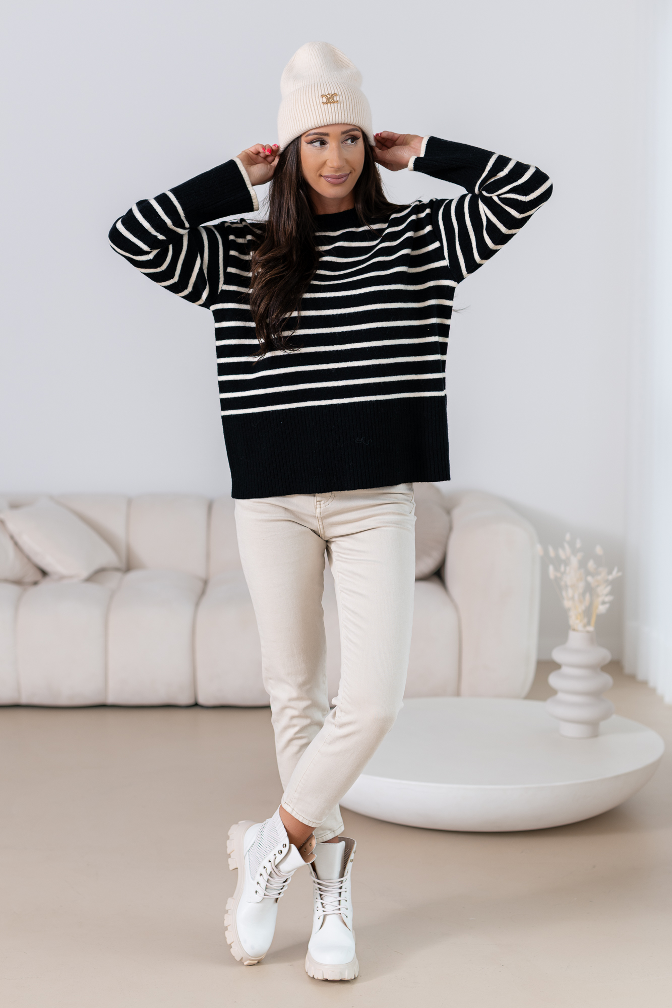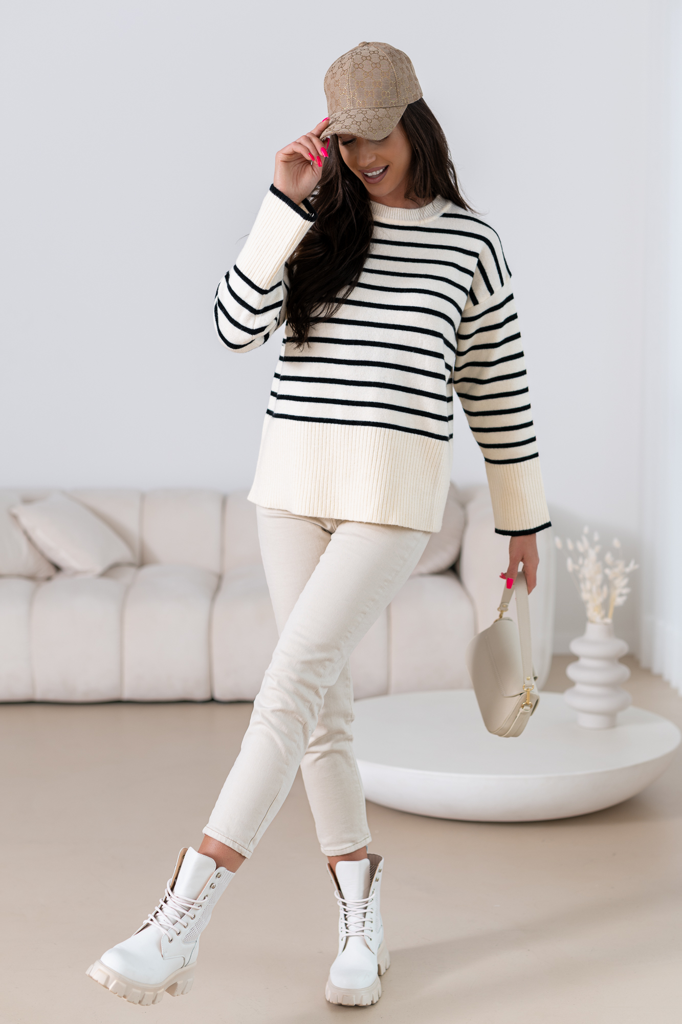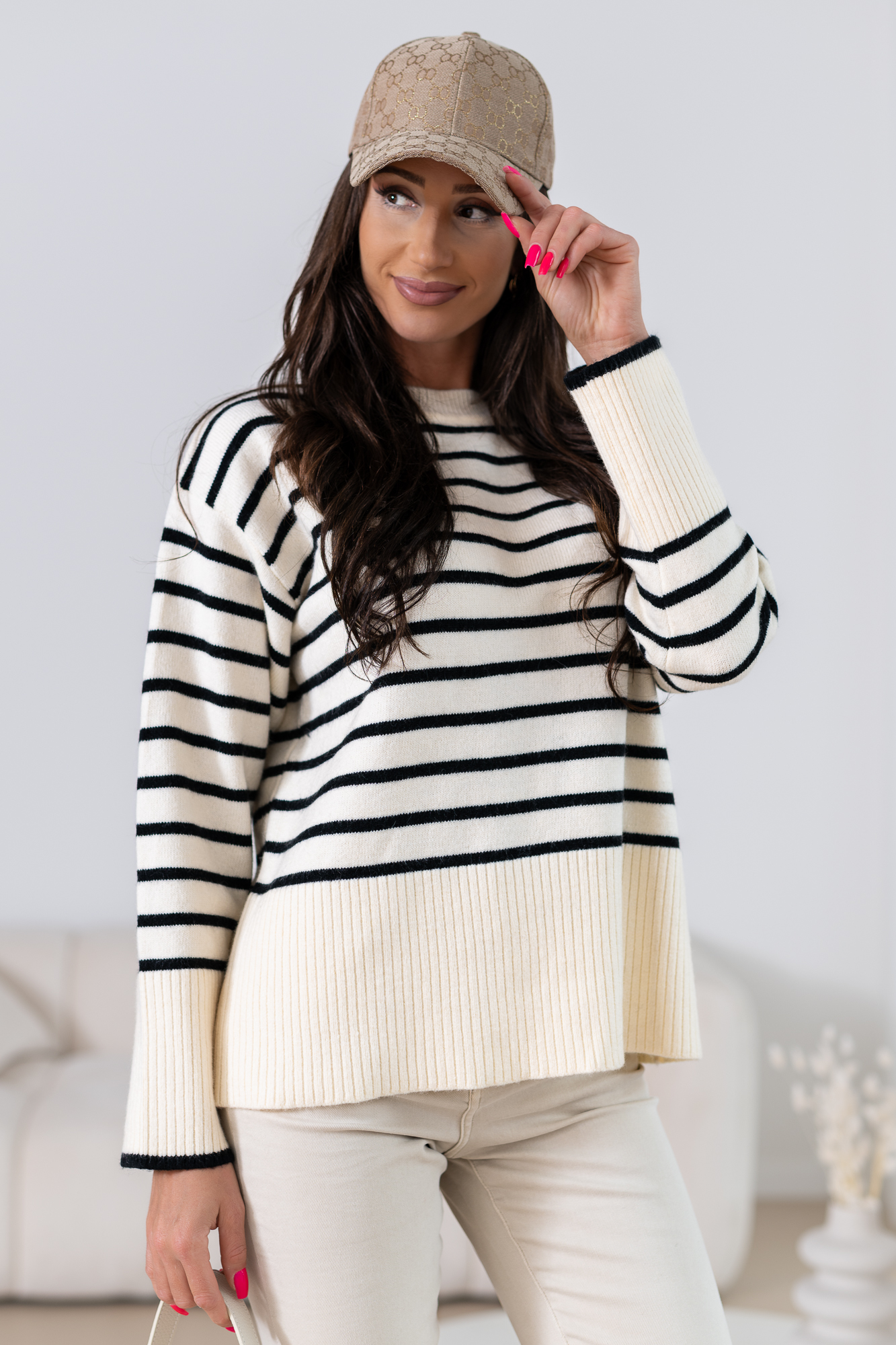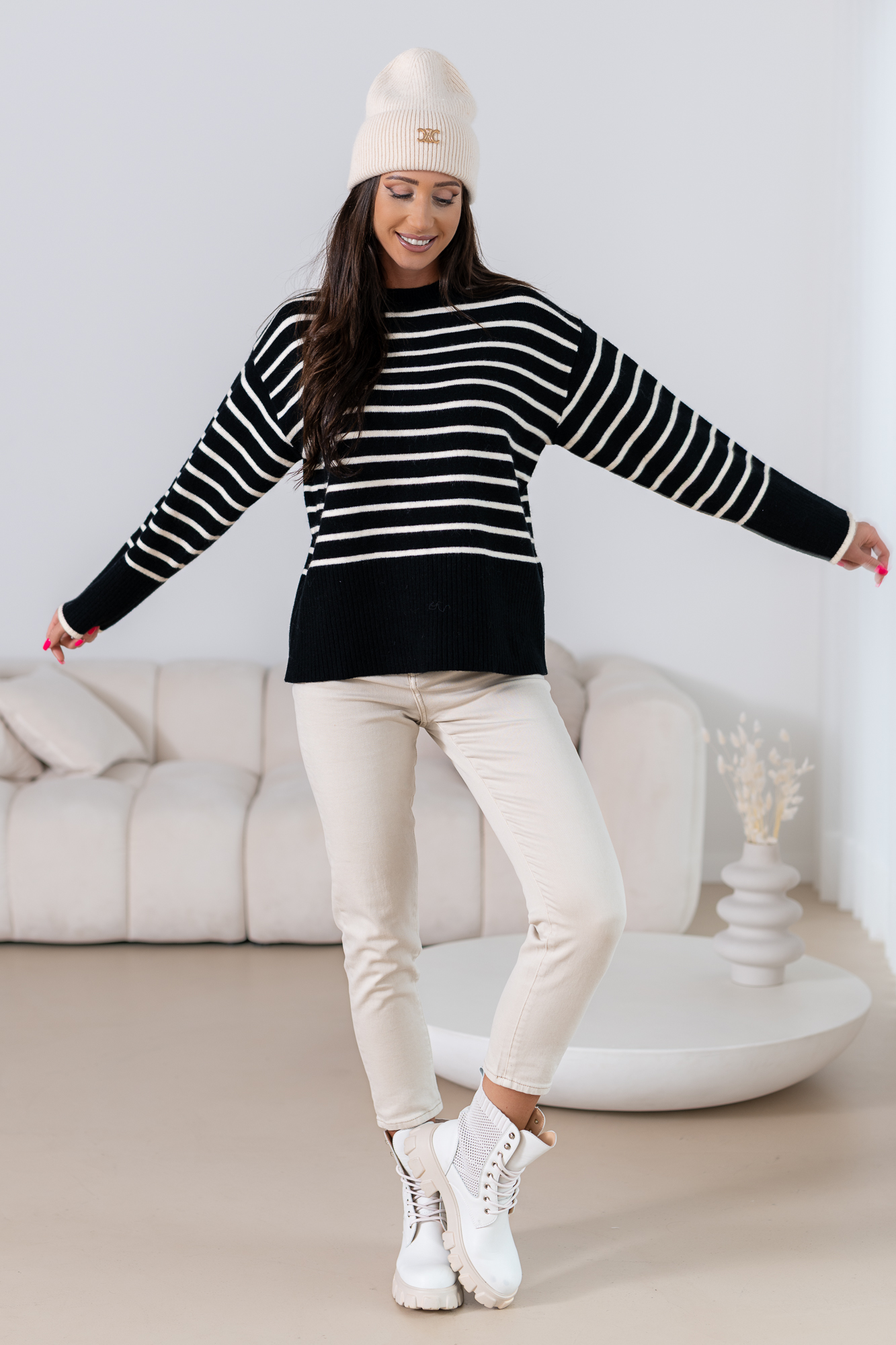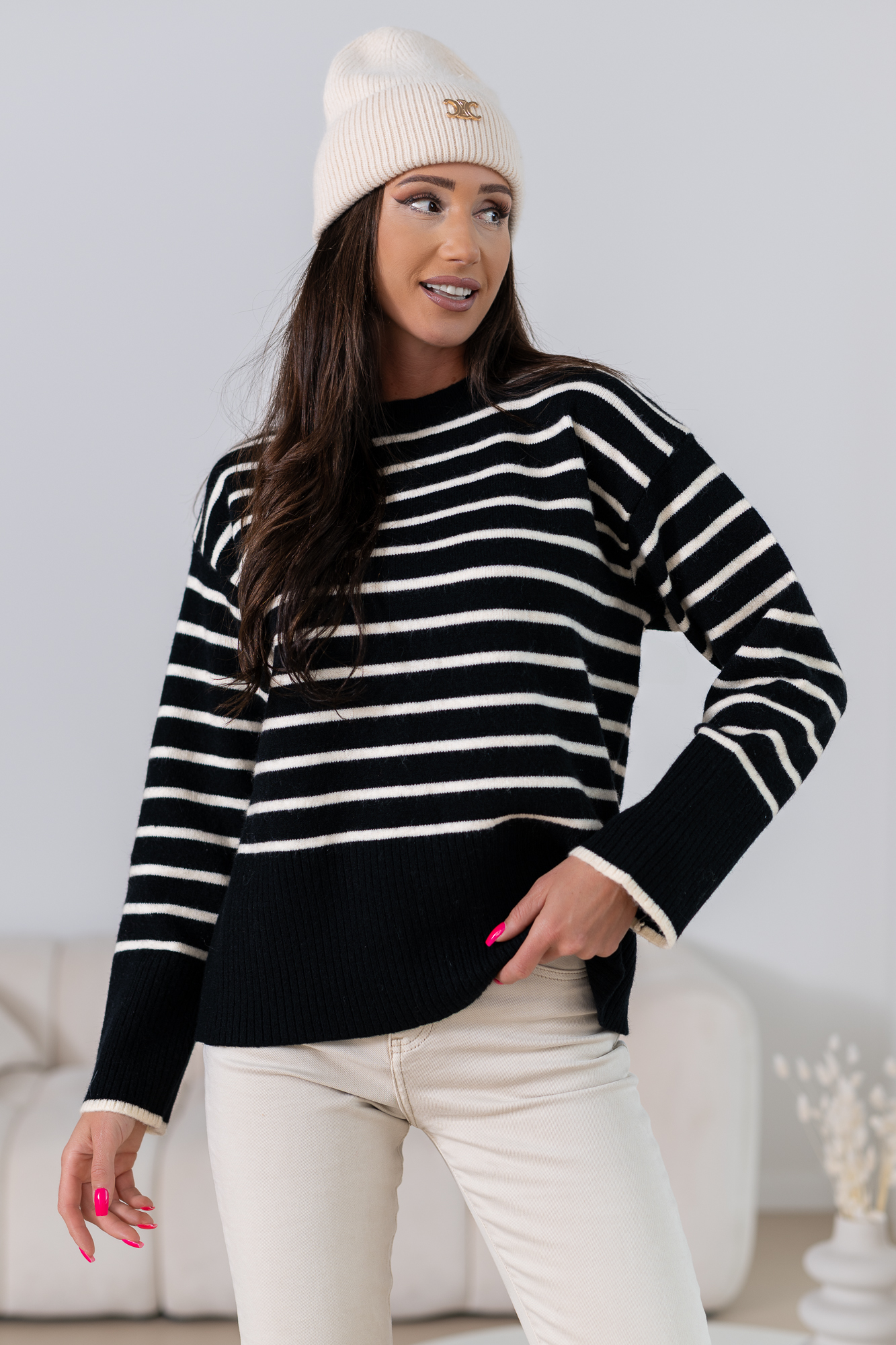 Casualowy sweter w dwóch zestawach kolorystycznych który idealnie sprawdzi się na nadchodzącą porę roku. Klasyczny i ponadczasowy wzór, obniżona linia ramion. Ten ponadczasowy model pozostanie w twojej szafie na wiele lat.