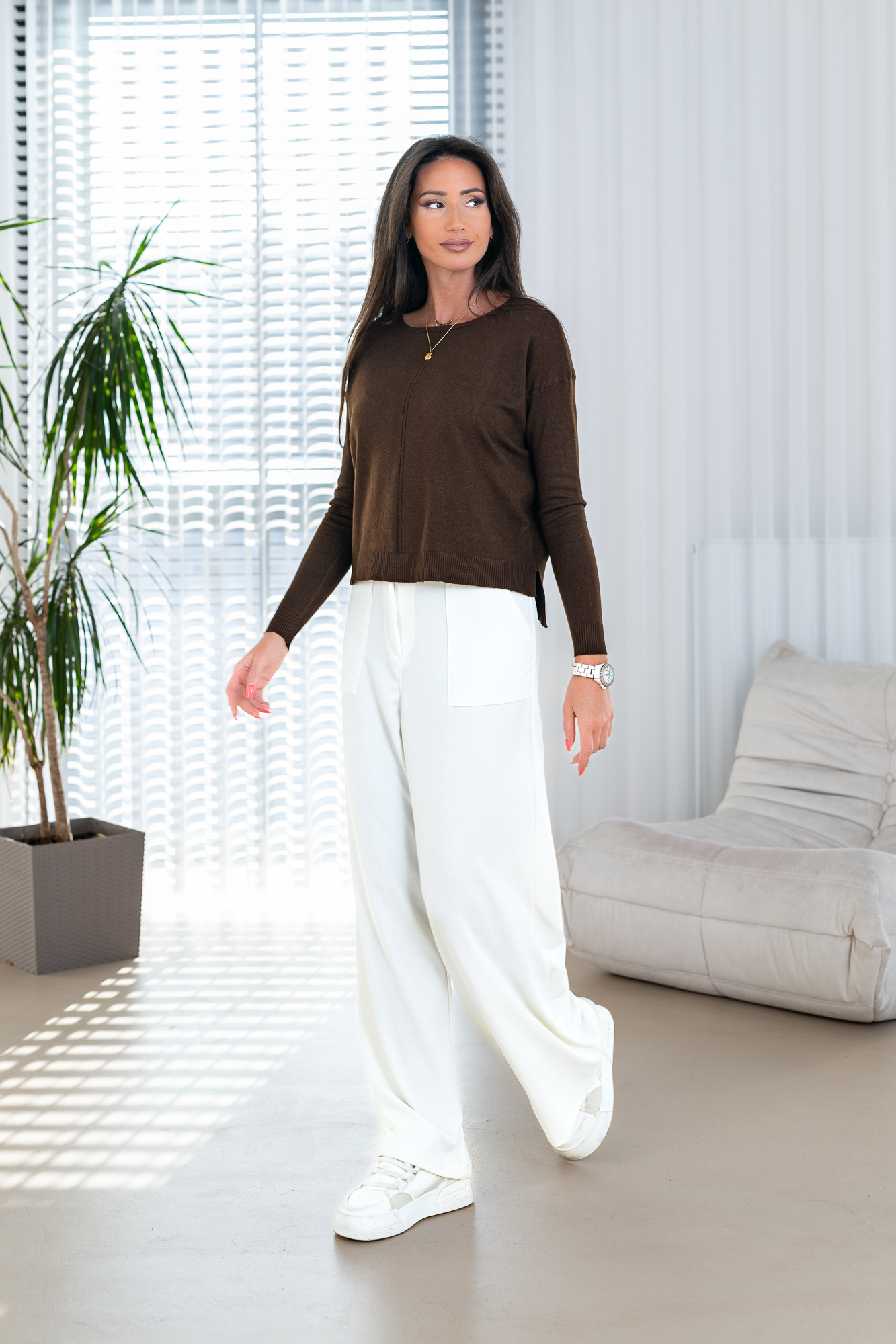 Lekki sweter o prostym kroju z delikatnym wykończeniem, idealny do codziennych stylizacji.