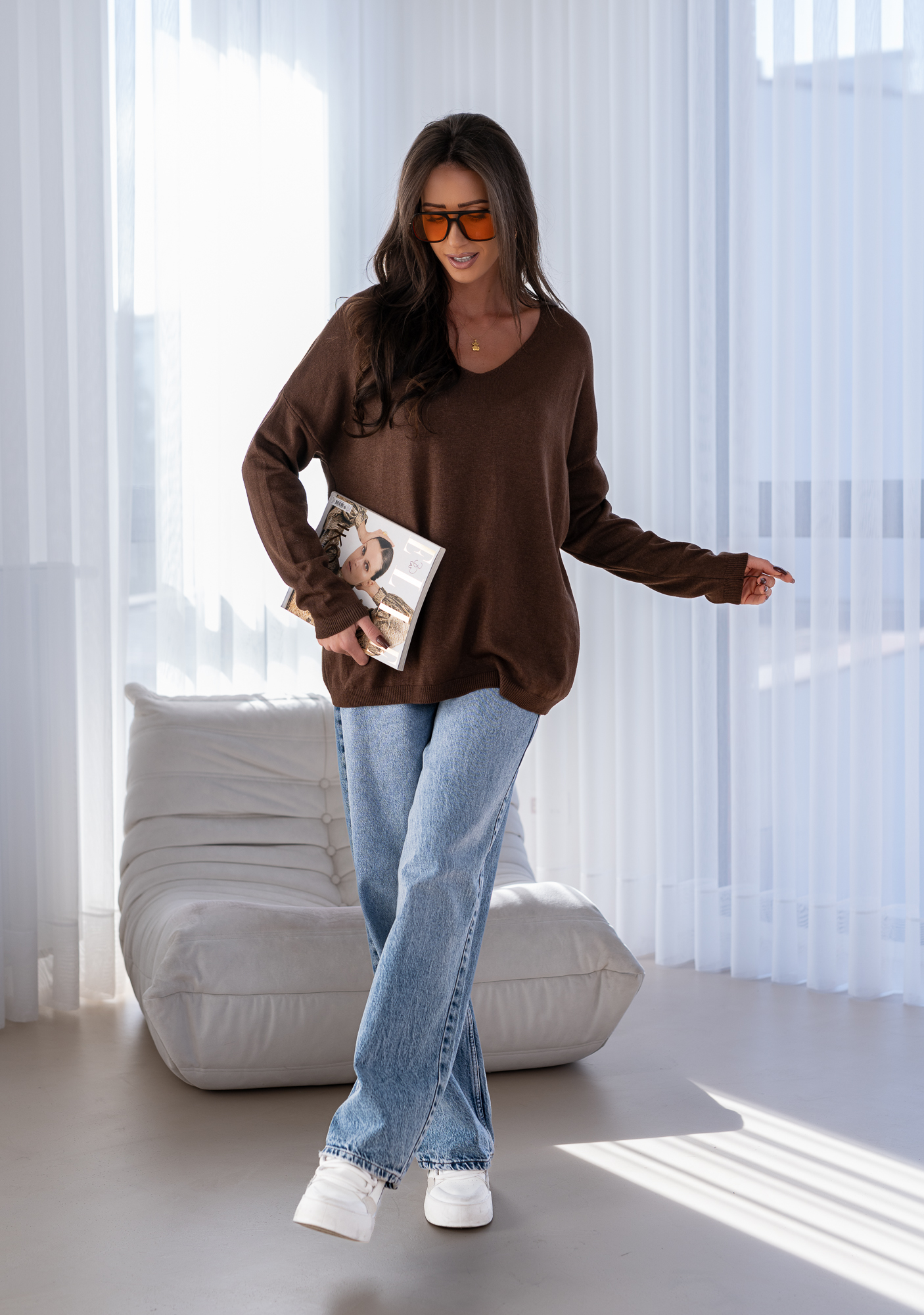 Przedstawiamy nasz luksusowy sweter z dekoltem w serek, który wniesie powiew elegancji i klasy do Twojej garderoby. Wykonany z najdelikatniejszej dzianiny, oferuje niezwykłą miękkość i komfort noszenia, sprawiając, że poczujesz się wyjątkowo w każdej sytuacji. Jego głęboki kolor nadaje mu wyrafinowanego uroku, idealnie komponując się z różnymi stylizacjami. Sweter doskonale dopasowuje się do każdej sylwetki, subtelnie podkreślając jej atuty. To niezastąpiony element garderoby, który świetnie sprawdzi się zarówno na spotkaniach towarzyskich, jak i w biurze. Dodaj odrobinę luksusu do swojego codziennego stylu z tym oszałamiającym swetrem.